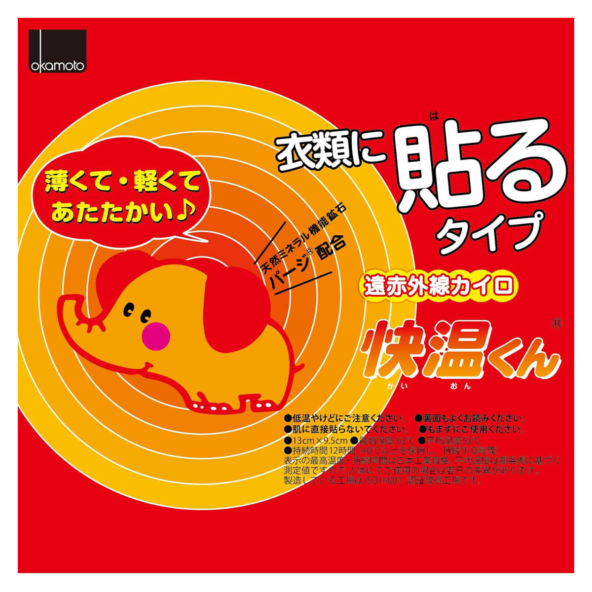 衣類に貼ることができる使い捨てカイロです。広範囲に温かさが広がり、持続性に優れた天然ミネラル鉱石パージを配合しています。