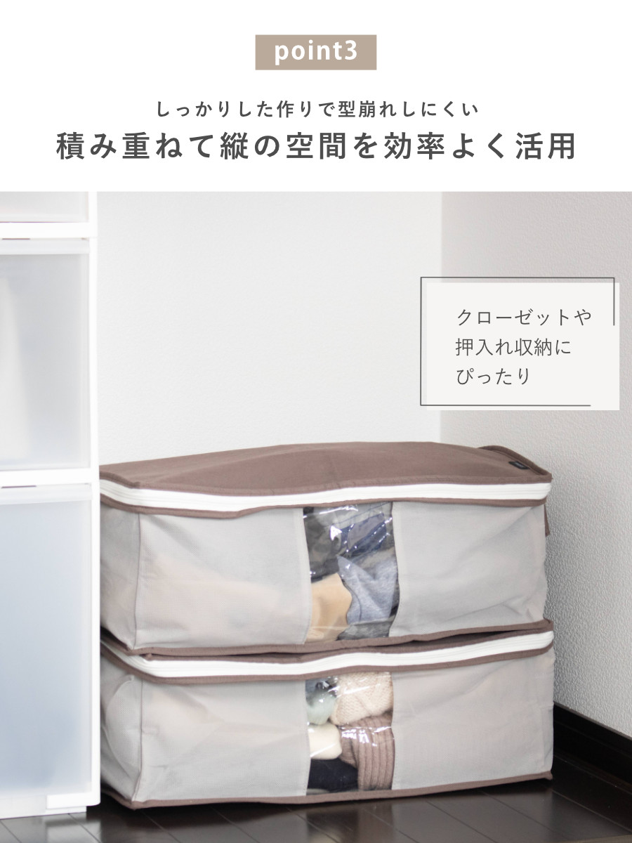 しっかりとした作りで型崩れしにくいため、重ねて使用できます。積み重ねることで縦の空間を有効活用でき、クローゼットや押入れの限られたスペースをすっきり整理できます。