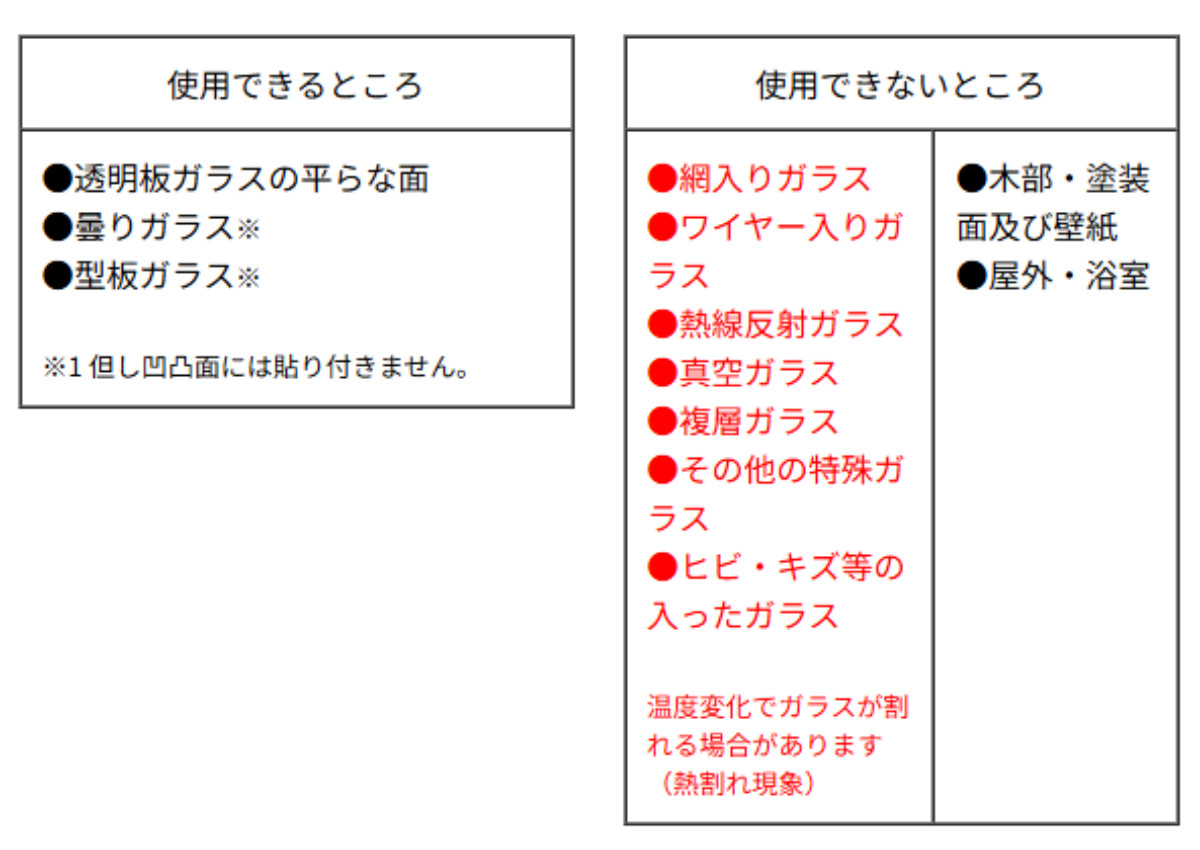 | 備考 | ※ご使用期間:6ヶ月(1シーズン) ※平滑な窓ガラス以外には貼り付きません。 ※特殊ガラス・木部・塗装面および壁紙・屋外・浴室には使用できません。 |