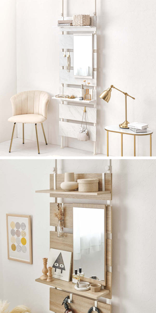 壁面に設置できる突っ張り式のウォールラックです。ミラーと棚板、フックが付属しているので、設置するだけで手軽に壁面にメイクスペースが出来上がります。天井や壁に穴を空けるなどの工事が不要なので、賃貸住宅にお住まいの方にもおすすめです。