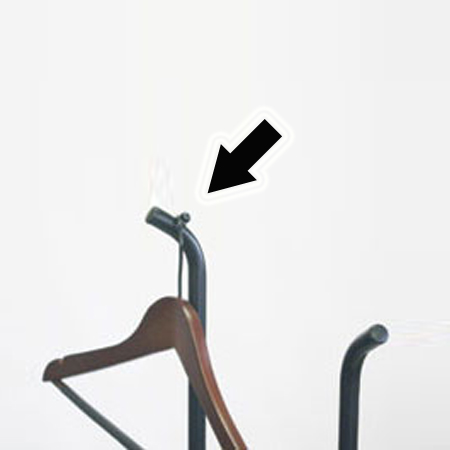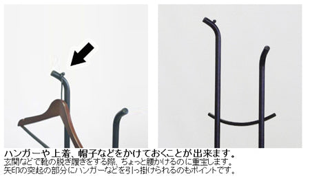ハンガーや上着、帽子などをかけておくことが出来ます。 玄関などで靴の脱ぎ履きをする際、ちょっと腰かけるのに重宝します。 矢印の突起の部分にハンガーなどを引っ掛けられるのもポイントです。 | ||