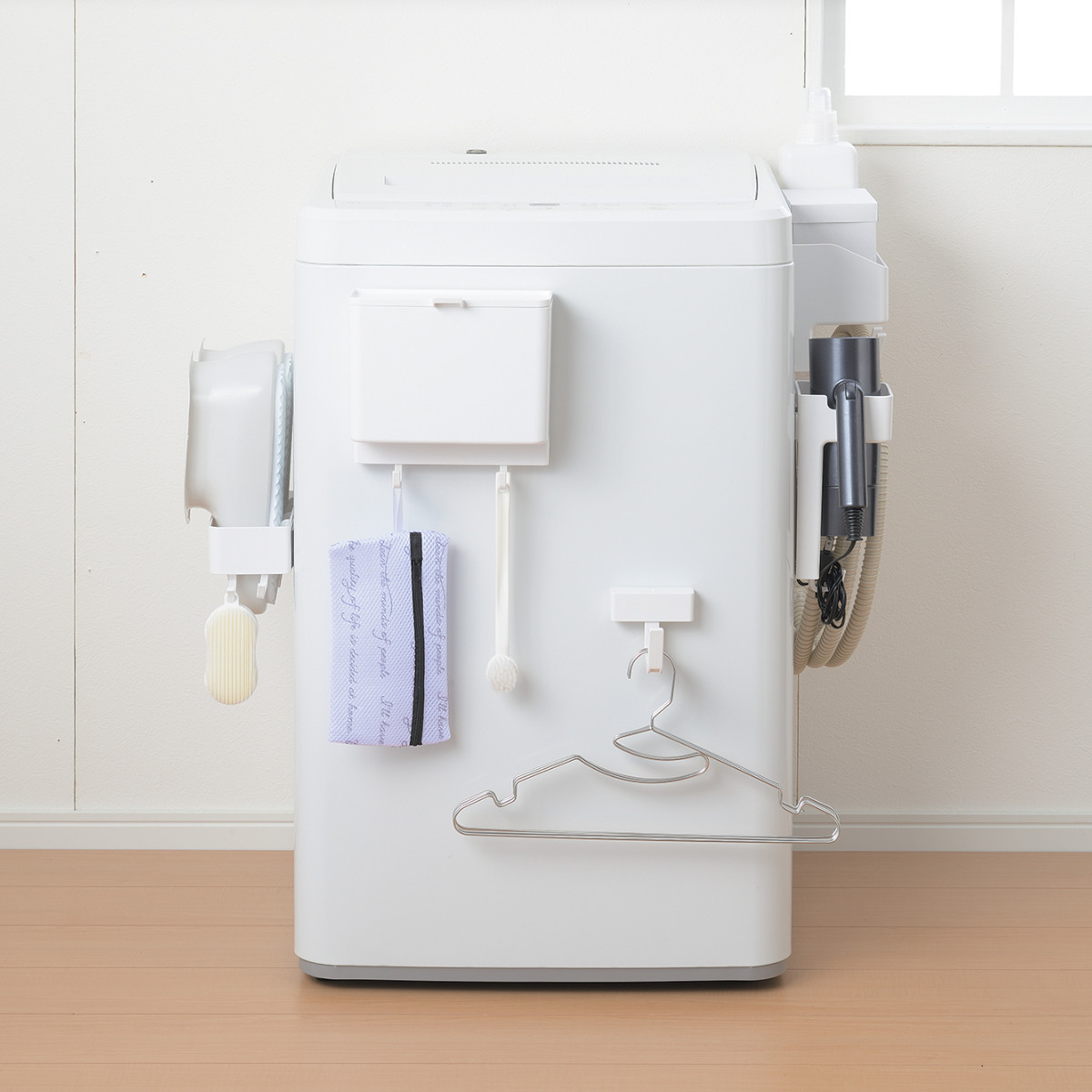 マグネットで簡単に取り付けができるフック付き収納ラックです。省スペース設計なので洗濯機横の隙間を活かし、洗剤や柔軟剤、洗濯ネットなどの小物をまとめて収納できます。シンプルなデザインで、洗濯機周りをスッキリと整った印象にしてくれます。