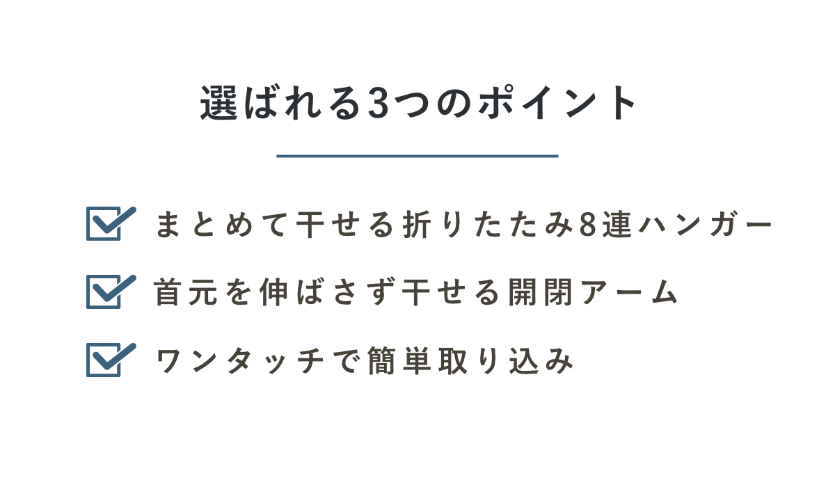首元を伸ばさず干せる開閉アーム