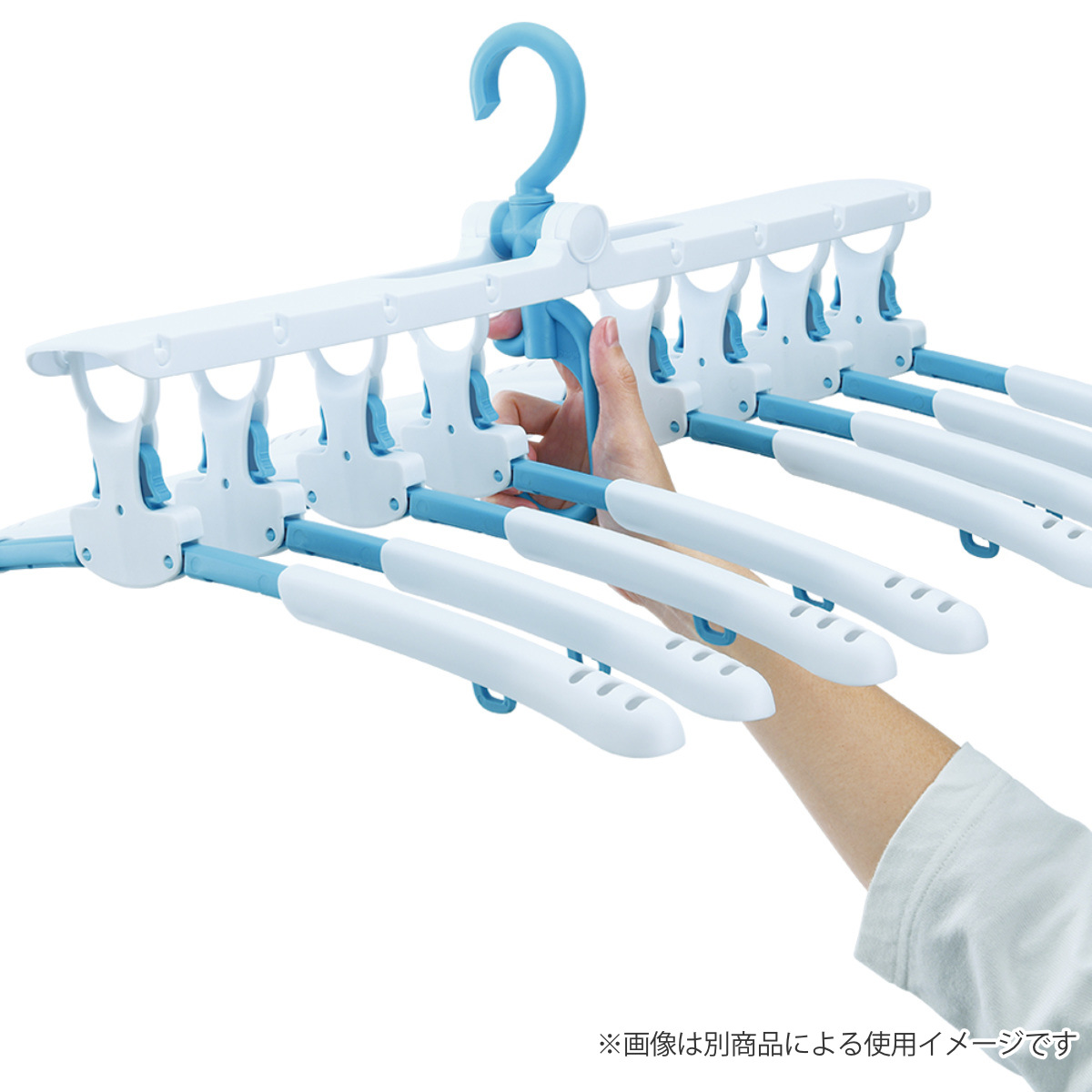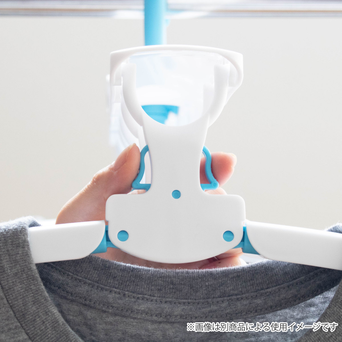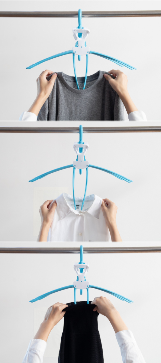アームが開閉するので、丸首Tシャツやハイネックも首元を伸ばさずに干せます。衣類を通して開くだけの簡単操作で、型崩れを防ぎながらスムーズに干せます。