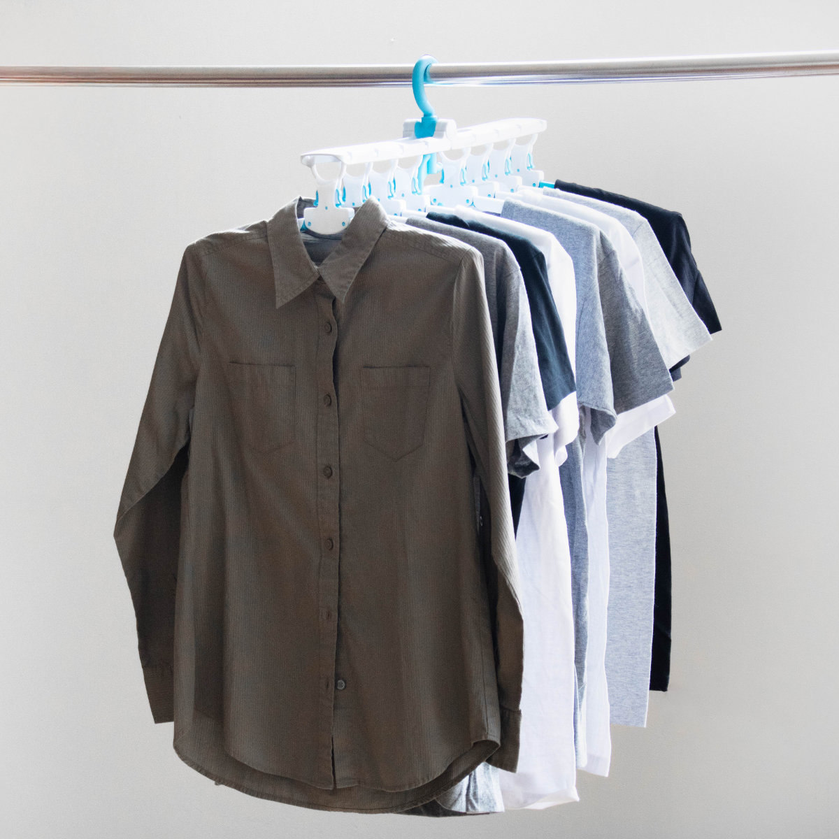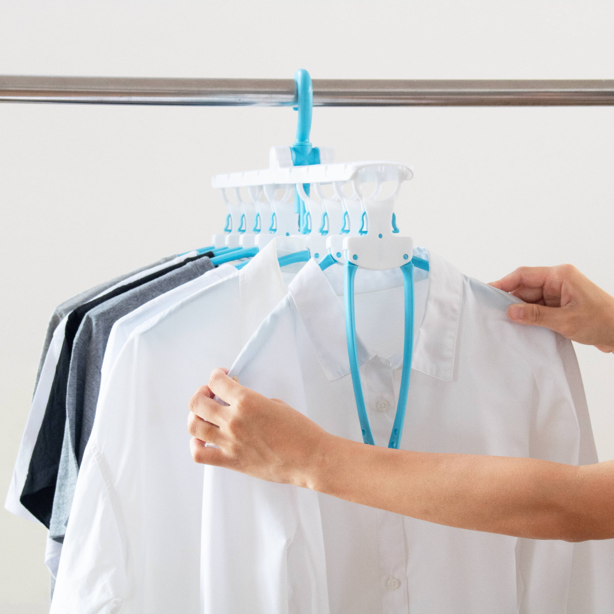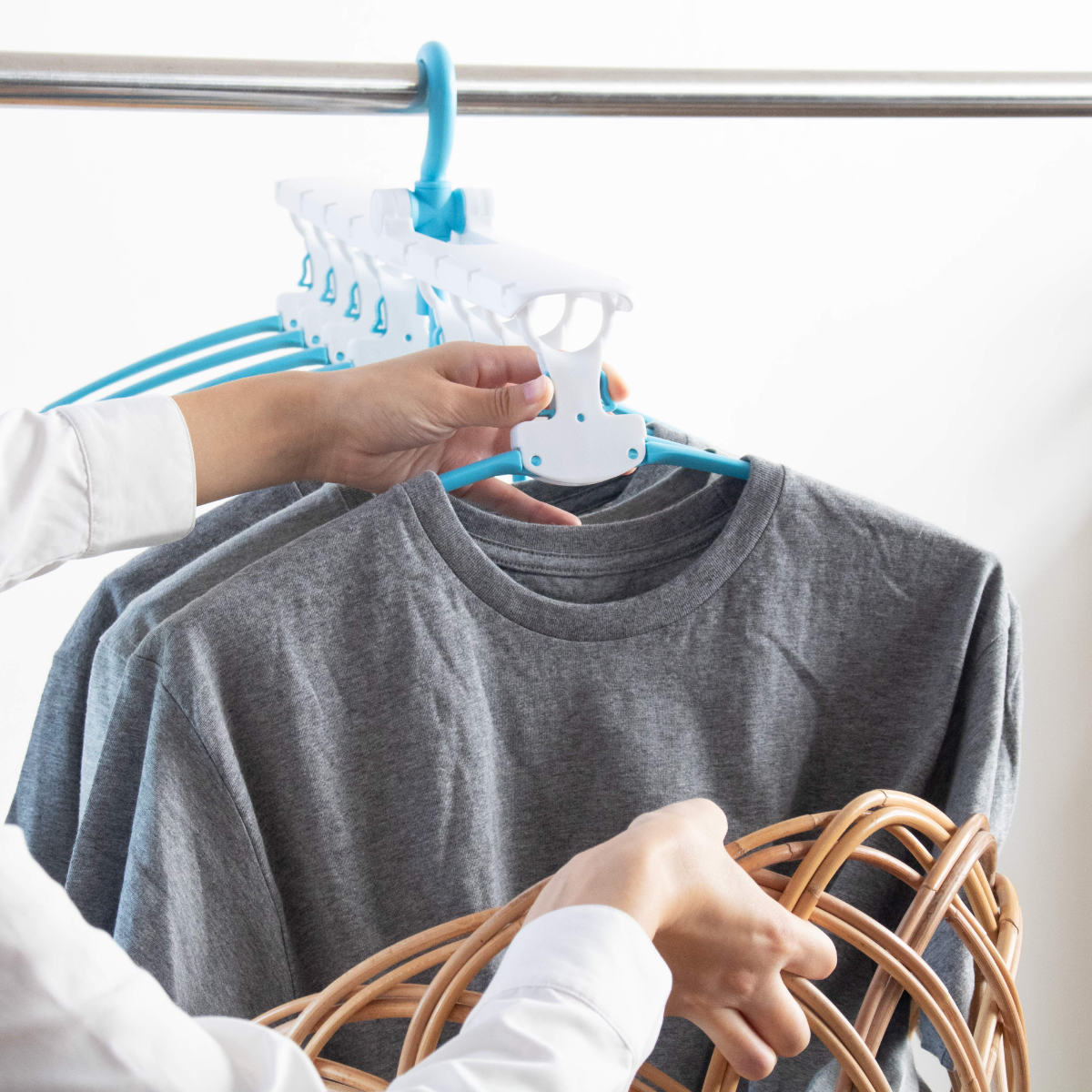 アームが開閉するので、丸首Tシャツやハイネックも首元を伸ばさずに干せます。衣類を通して開くだけの簡単操作で、型崩れを防ぎながらスムーズに干せます。