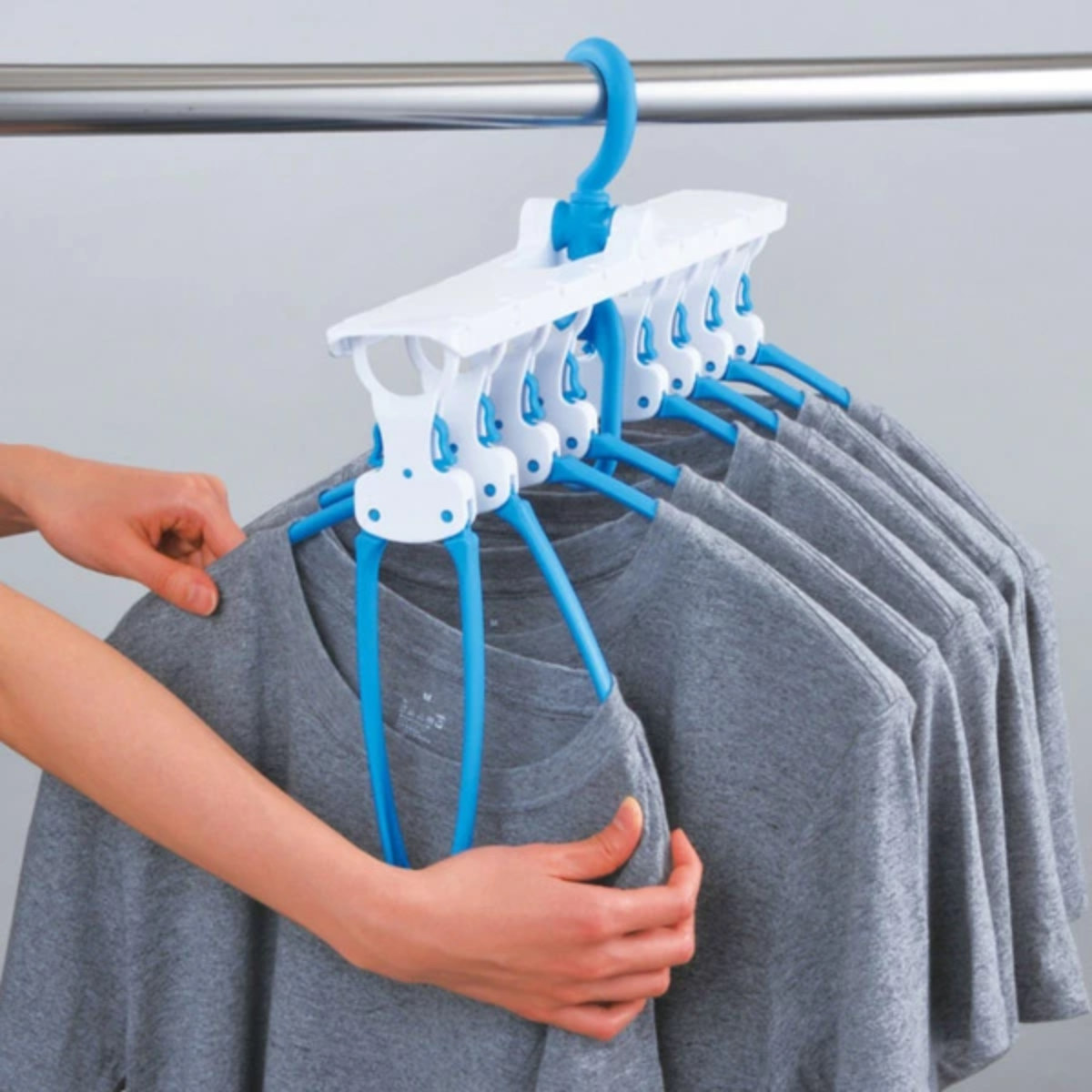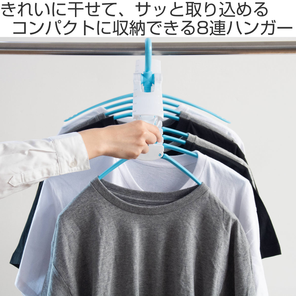 ハンガー8本分をまとめて干せ、コンパクトに折りたためる8連ハンガーです。風が吹いても衣類が偏らず、等間隔で干せるので乾きやすく、省スペースでたっぷり干せます。