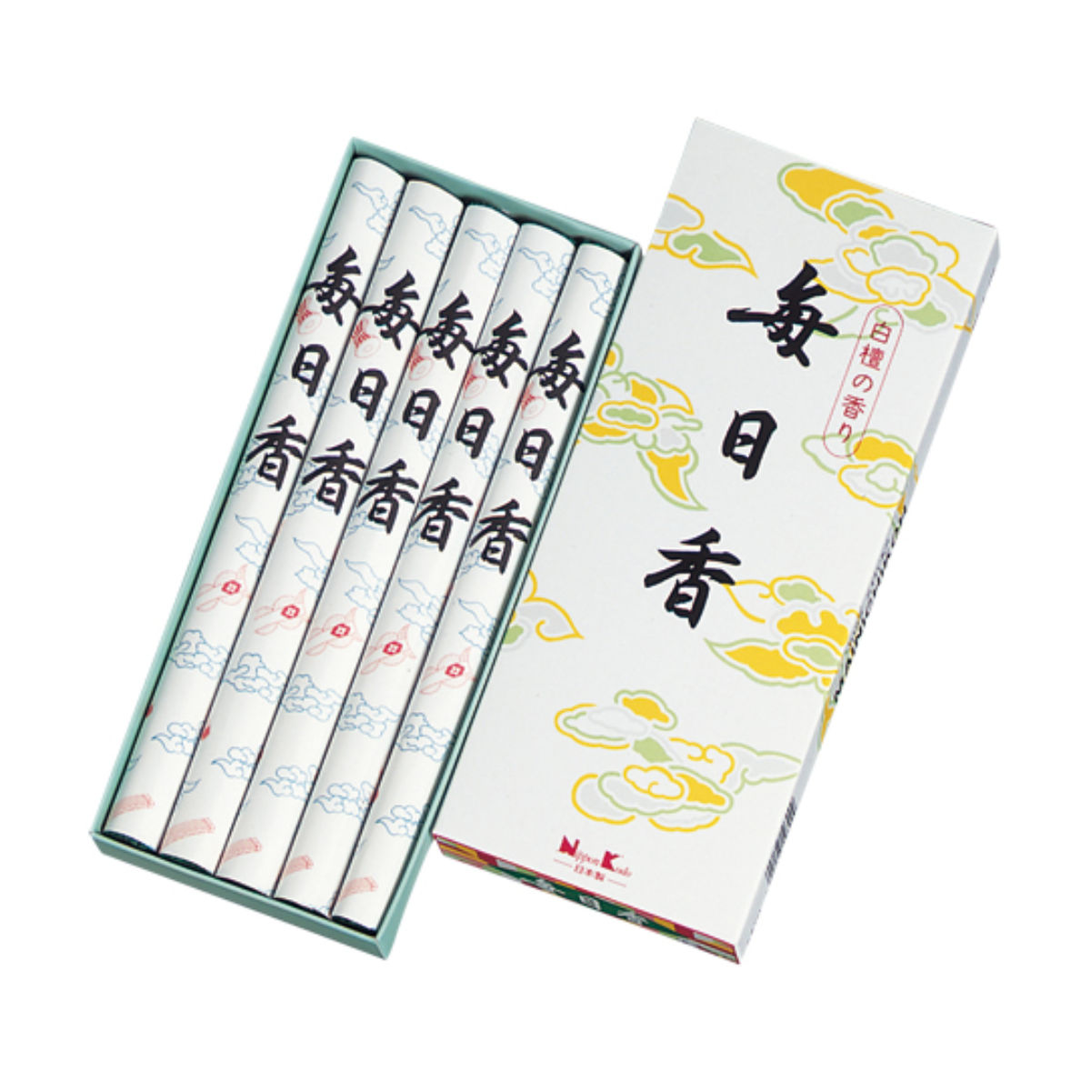 日々を強く生きてゆく人の心の糧として、毎日使ってもらいたいという願いが込められた「毎日香」。日本中で多くの方に愛され続ける、日本のお線香の代名詞的ブランドです。親しみとやすらぎの白檀の香り。長寸のお線香を1把ずつ使うことができる束ねたタイプで5把入りです。