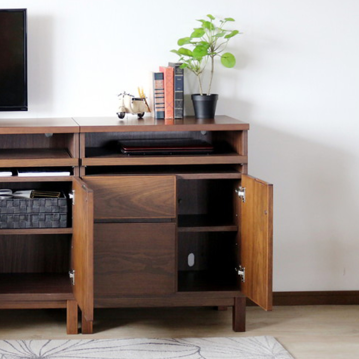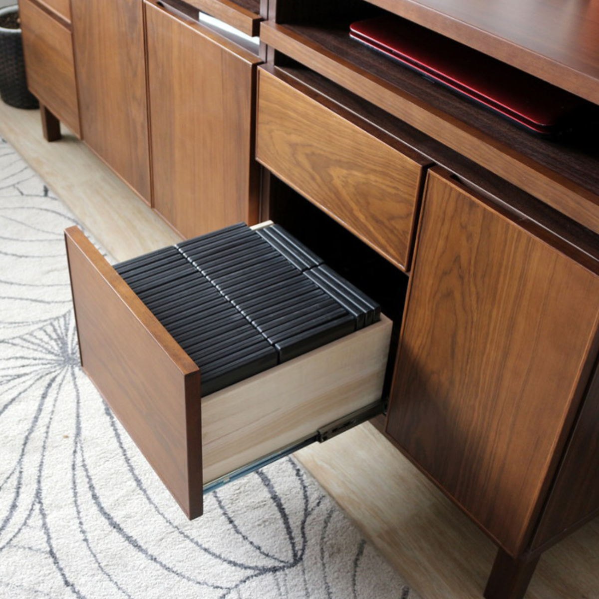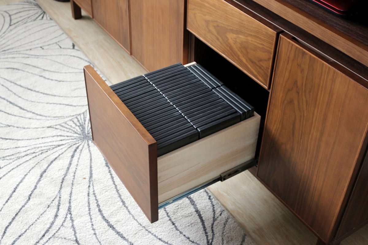 リビング周りの小物の収納に最適な2段の引出し。下段はフルスライドレール仕様で奥までしっかりと見渡せます。DVDなどをたっぷり収納しても、スムーズに開閉ができます。