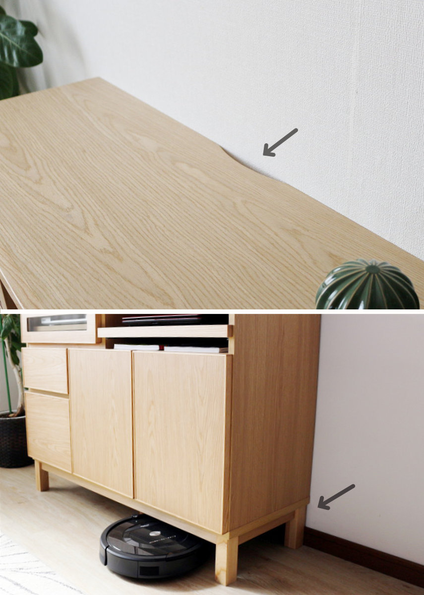 コードを避けられるように、天板後方には切り欠き加工が施されています。また、高めの脚部で幅木を避けることができるので、壁にぴったりと付けて設置できます。