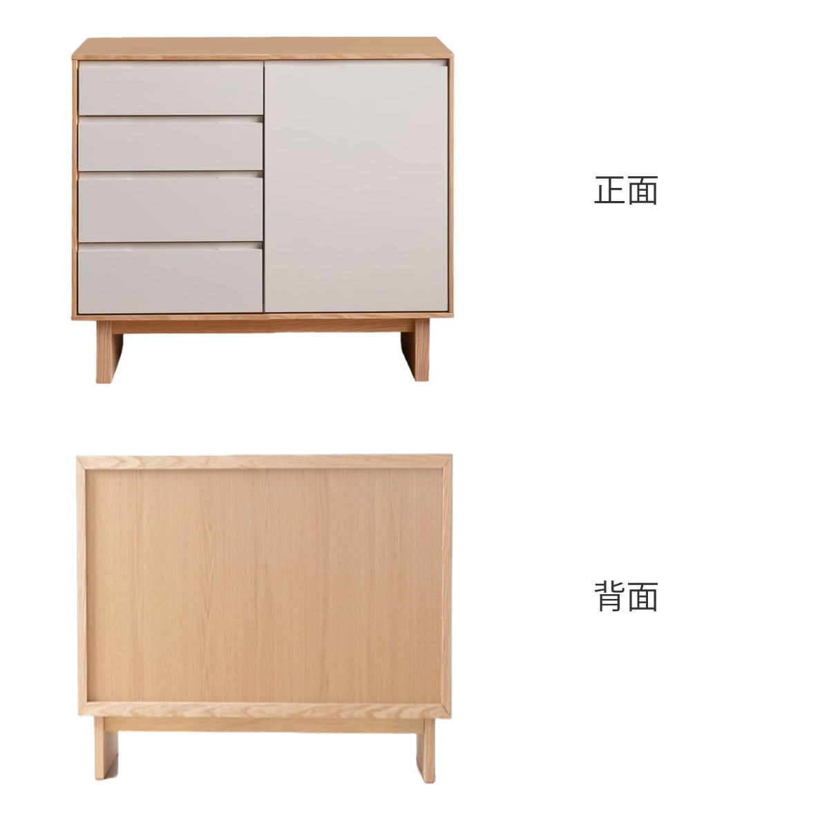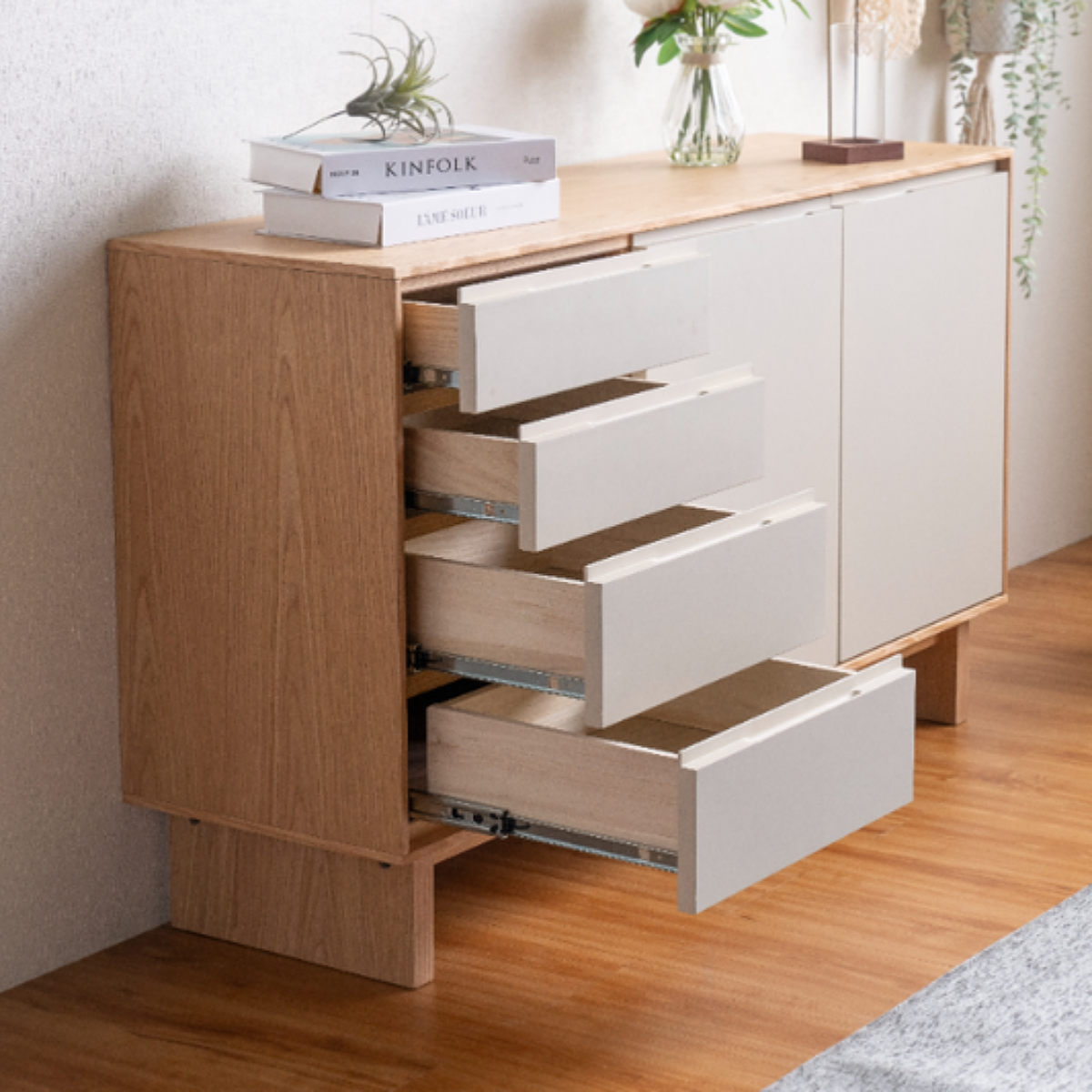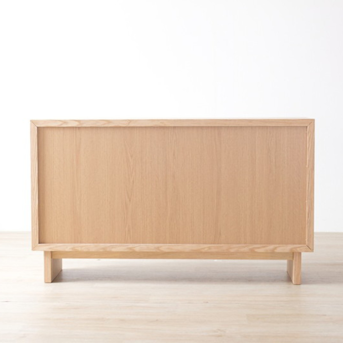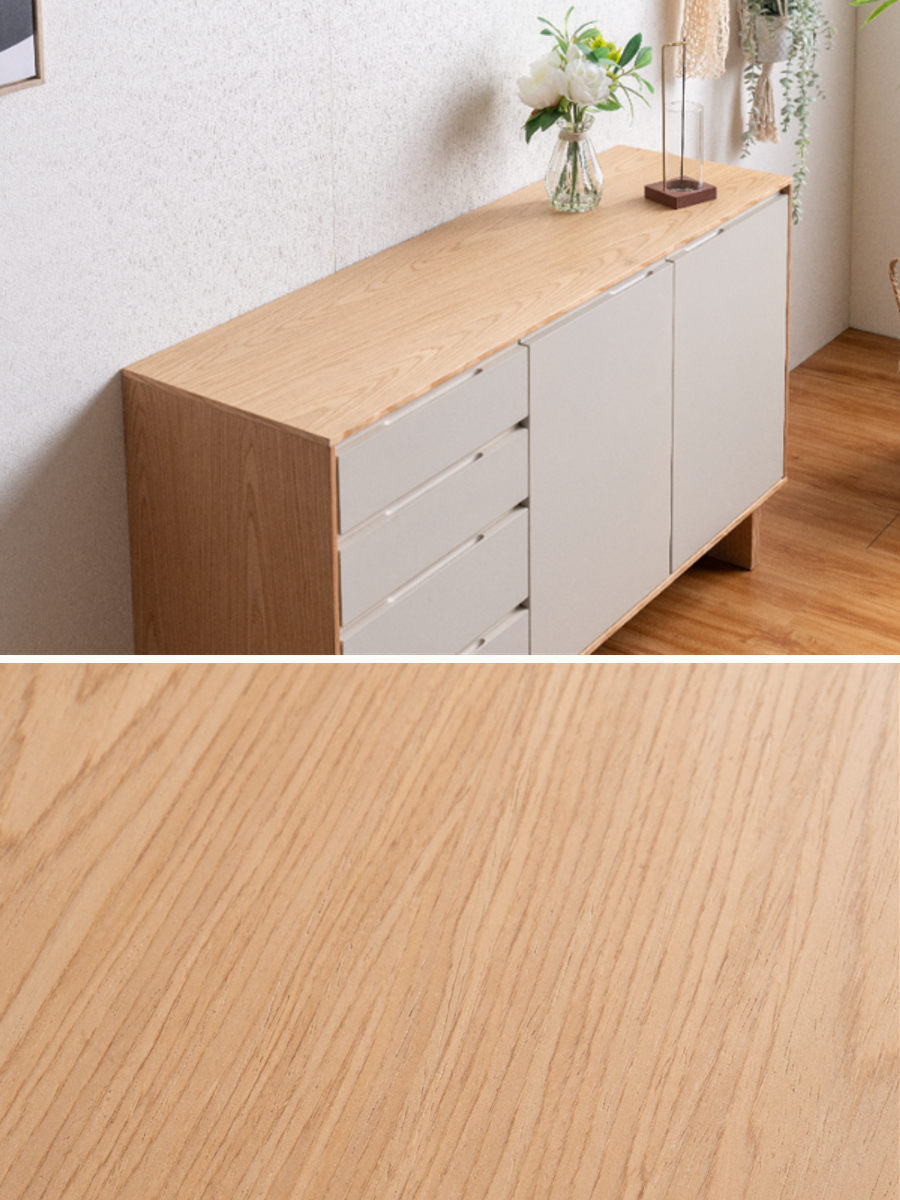 環境に配慮したFSC認証を取得した天然木工芸突板を使用したサイドボードです。ナチュラルなフレームとグレージュのツートンカラーが、空間に明るさと優しさをプラスします。隠す収納で生活感を与えず、すっきりと片付いた空間に。