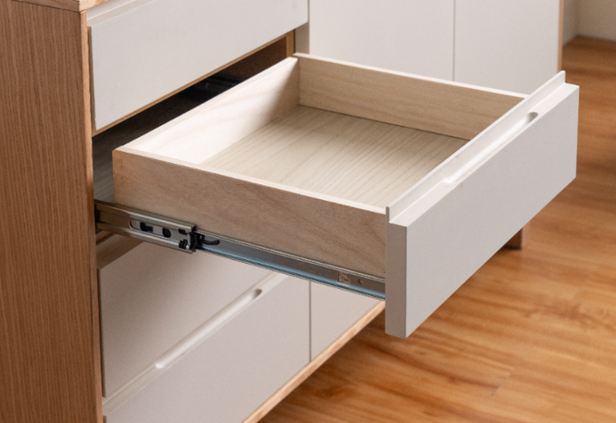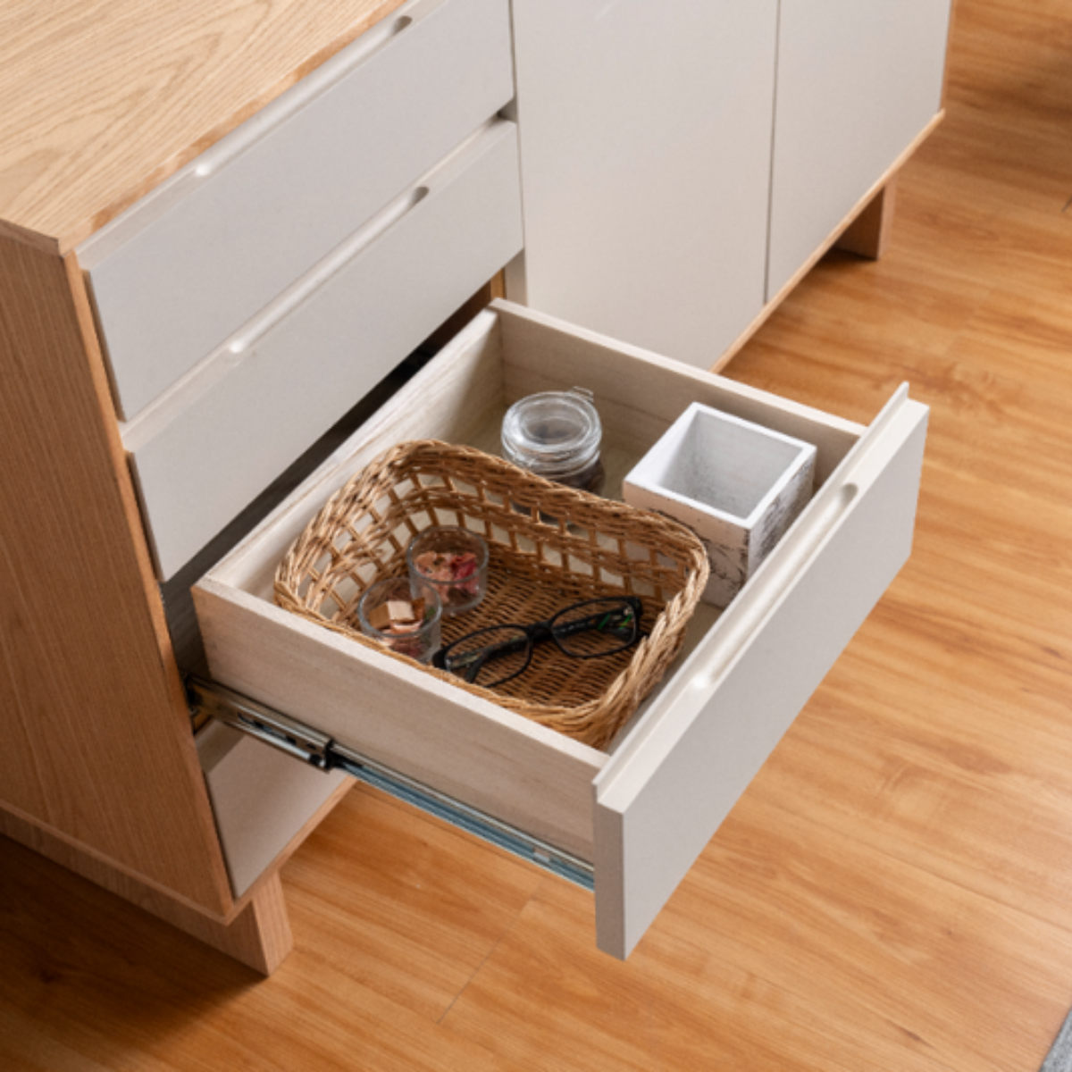 リビング周りの小物の整理に最適な引出しはフルスライドレール仕様。奥までしっかりと見渡せて、たっぷり収納してもスムーズに開閉ができます。ストッパー付きなので、万が一引き出しすぎてしまっても抜け落ちる心配がありません。