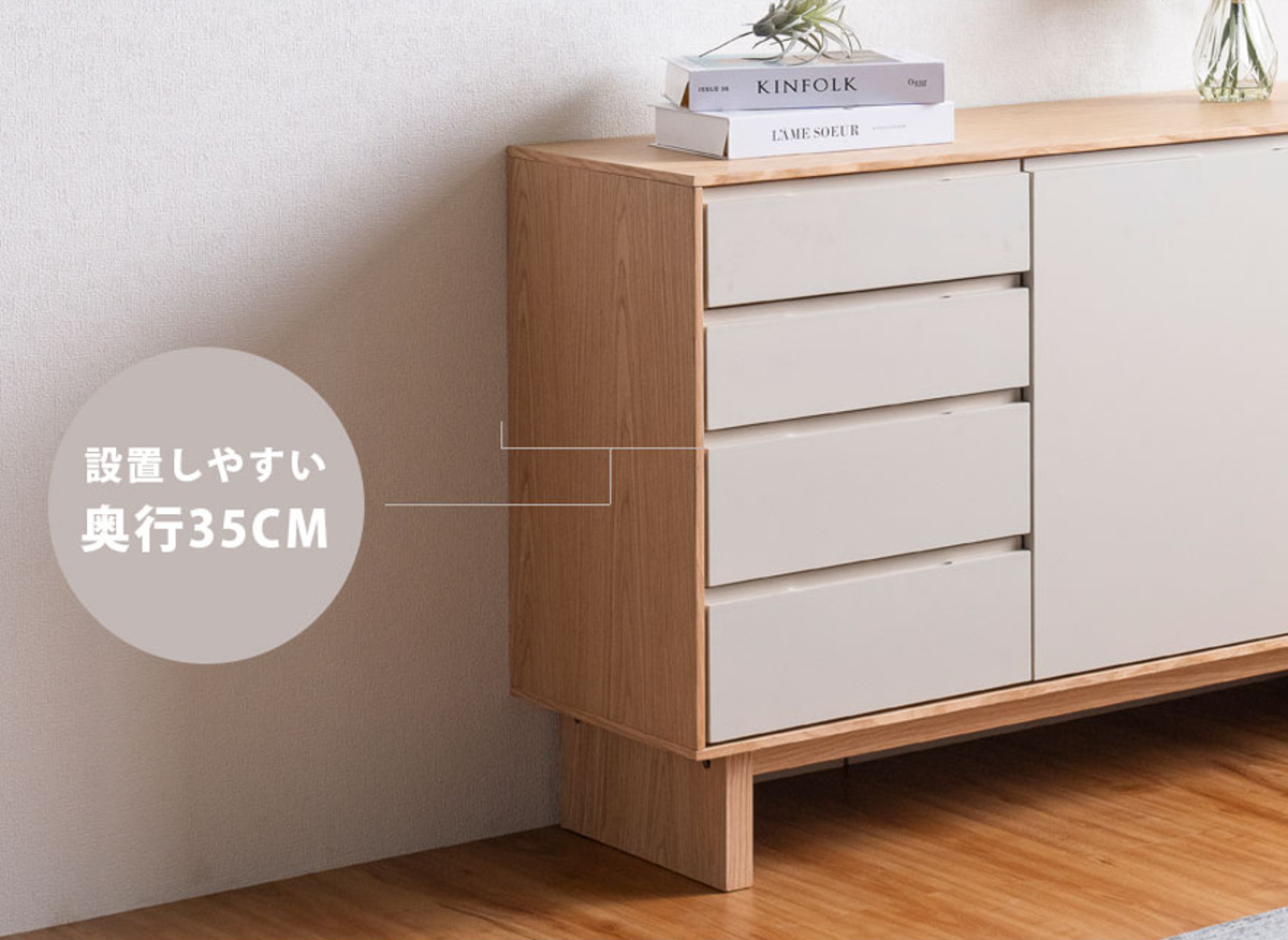 奥行約35cmの薄型設計です。リビングでの使用の際にも圧迫感を感じにくく、お部屋のスペースを広く使えます。