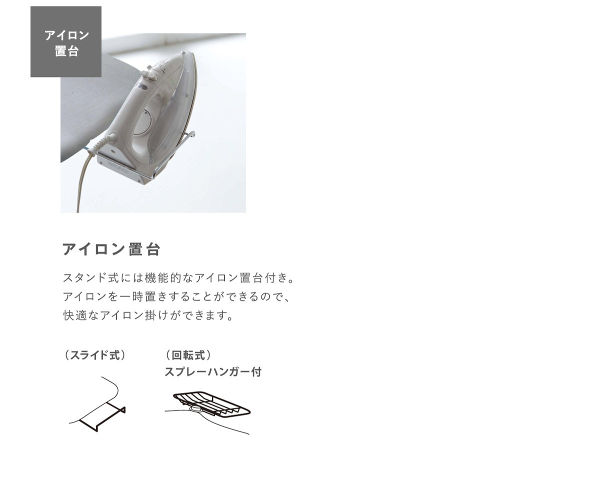 ●スカートが奥まで入るX脚を採用しているので、まわし掛けもスムーズです。<br>●出し入れしやすいスライド式のアイロン置き台は、使わない時にはしまっておけます。