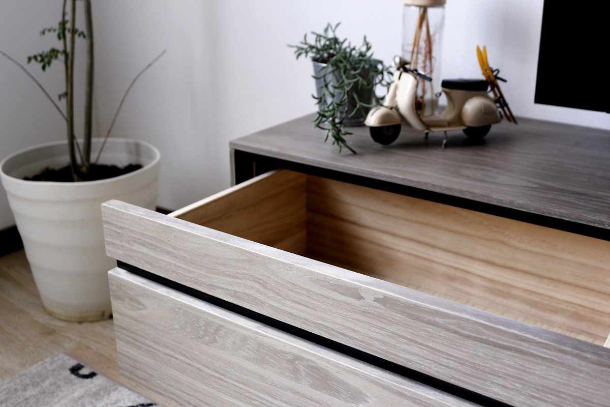 リビング周りの小物収納に最適な深さの引出しは、フルスライドレール仕様で奥まで見渡せます。伝統的なロッキング加工で耐久性に優れ、内部には湿気や虫に強く変形しにくい上質な桐材を使用し長くお使いいただけます。