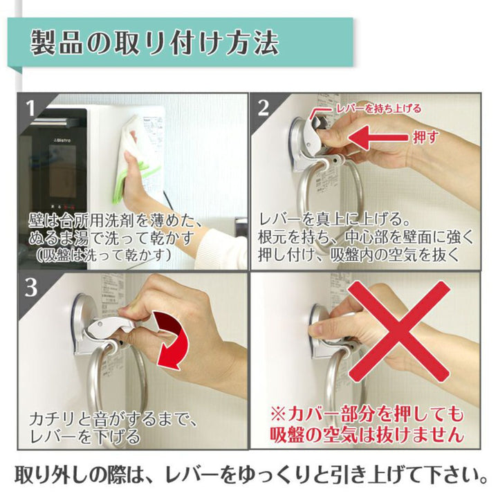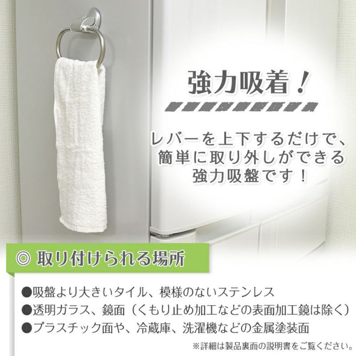 ●レバーを上下するだけで簡単に取り外しができる強力吸盤のタオル掛けです。