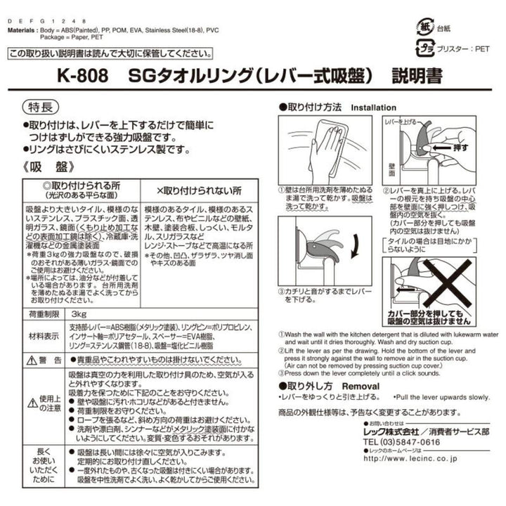 | 材質 | 支持部・レバー:ABS樹脂(メタリック塗) リングピン:ポリプロピレン スペーサー:EVA樹脂 リング:ステンレス鋼管(18-8) 吸盤:塩化ビニル樹脂 |