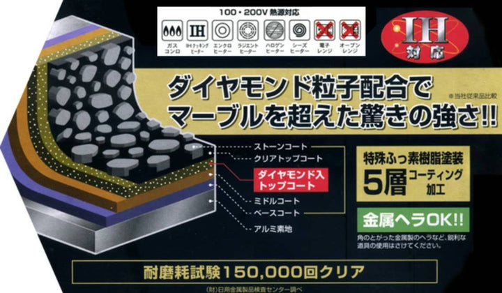ダイヤモンド粒子配合でマーブルコートを超えた驚きの強さのフライパンです。(※メーカー従来品比較)特殊フッ素樹脂塗装5層コーティング加工で金属ヘラが使えます。耐摩耗試験15万回の優れた耐久性とこびりつきにくさです。