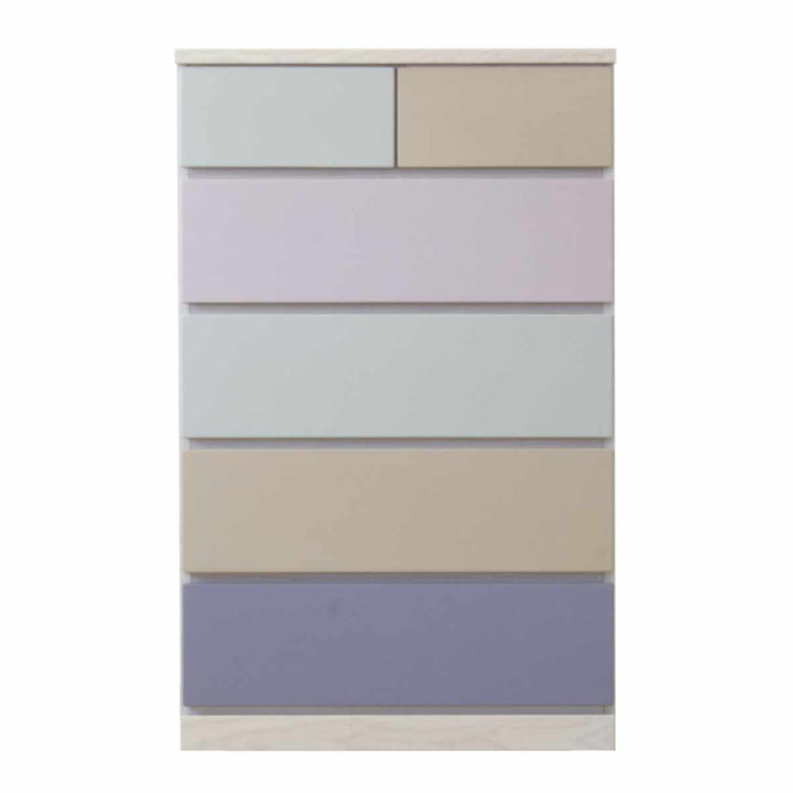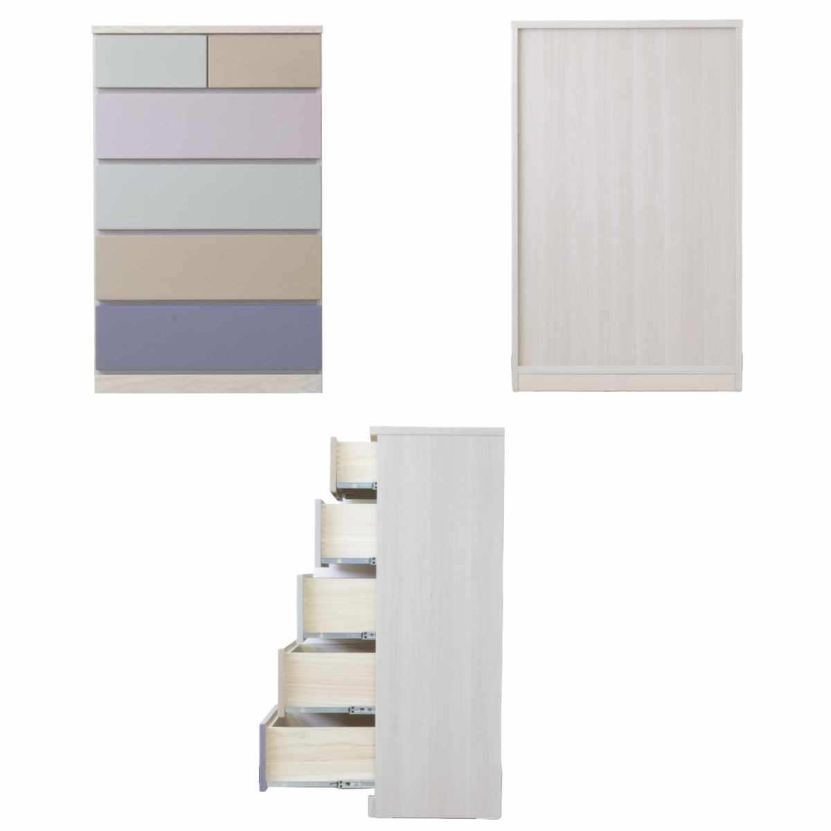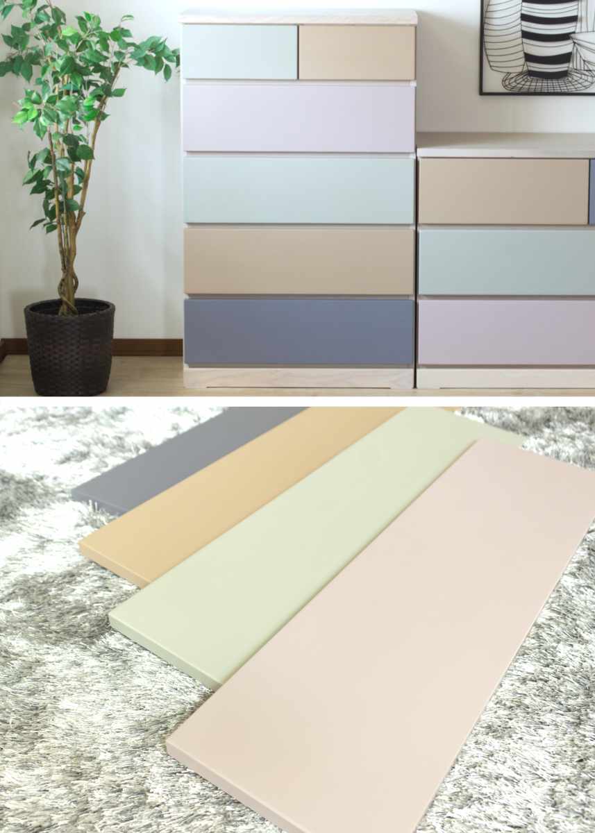 お好みに合わせて前板を組み合わせられるチェストです。4色のパステルカラーが並ぶことで、お部屋全体をやさしく彩ります。ナチュラルな木目とやわらかな色合いが調和し、見ているだけで気分が華やぐデザインです。