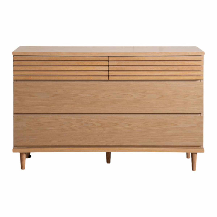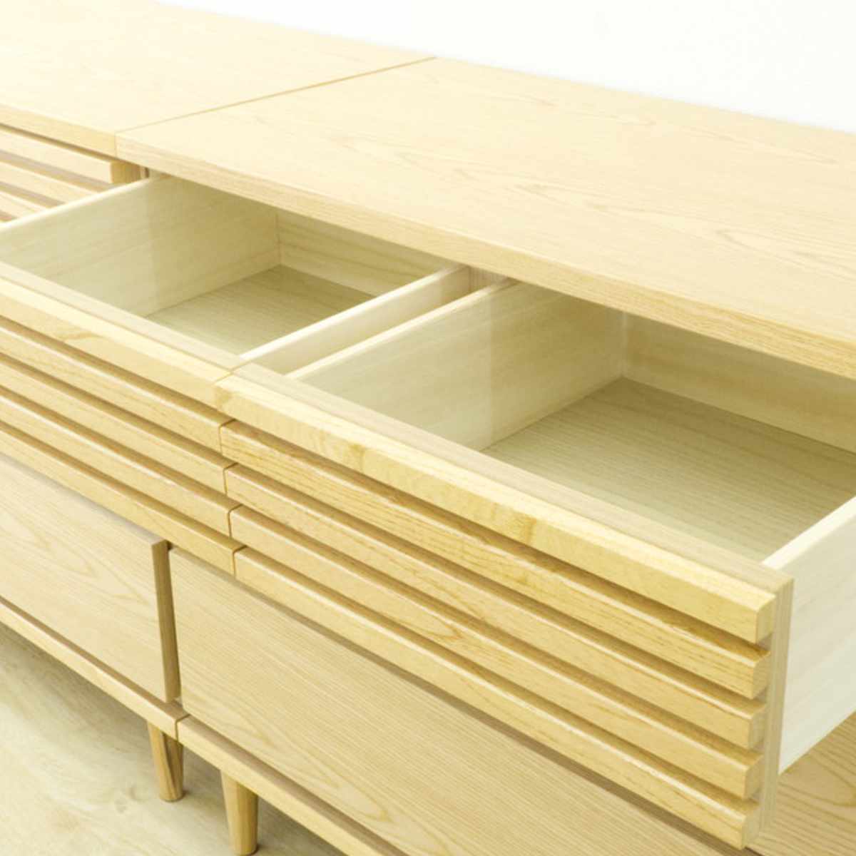 天然木の優しさが感じられるチェストです。ルーバー部分には無垢材をふんだんに使用し、美しい木目の表情が際立ちます。温かみのあるナチュラルな色合いと質感で、リビングや寝室にやさしい印象をプラスします。