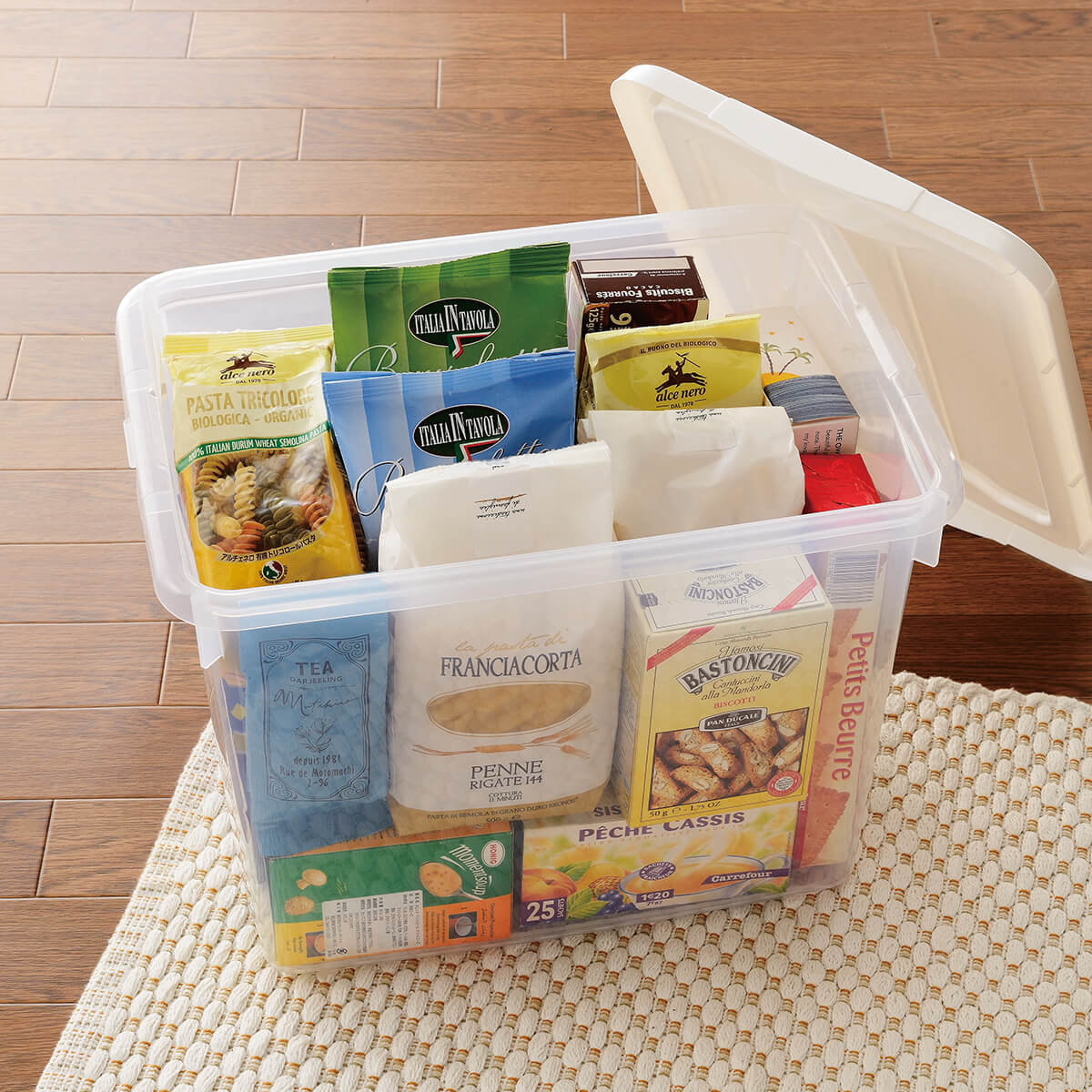 ワンタッチで開閉できるロックが付いた収納ボックスです。シリアルやパスタなど、背の高い食品のストック収納におすすめです。おもちゃや衣類、日用品など何でも気軽に収納していただけるフリーボックスです。