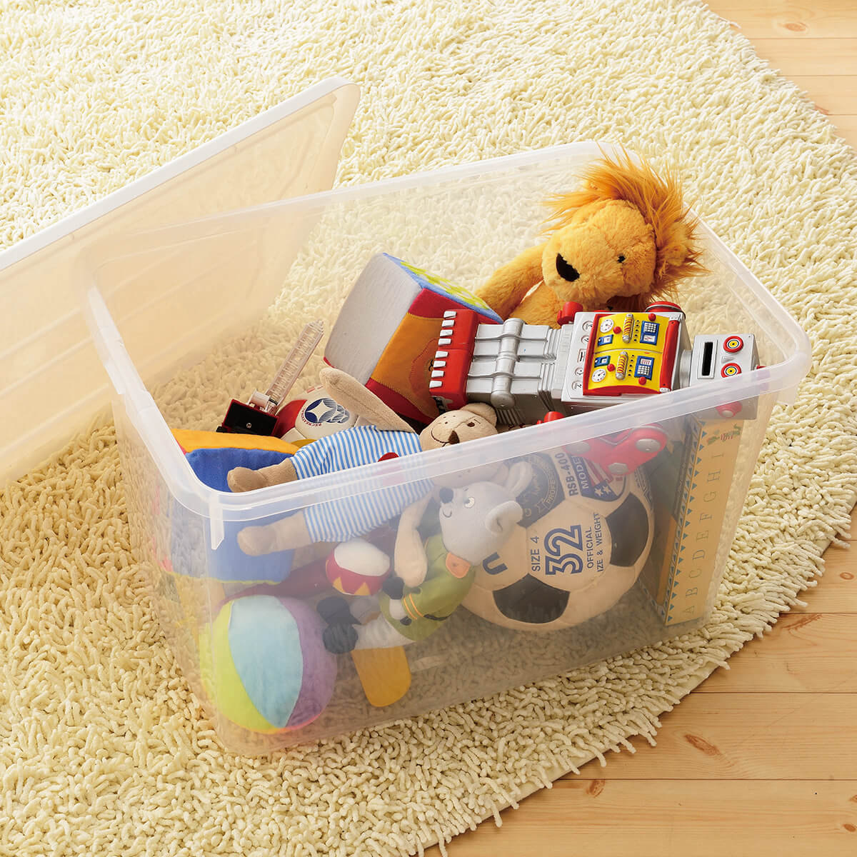 ワンタッチで開閉できるロックが付いた収納ボックスです。ぬいぐるみやボールなど、大きめの物の収納におすすめです。おもちゃや衣類、日用品など何でも気軽に収納していただけるフリーボックスです。