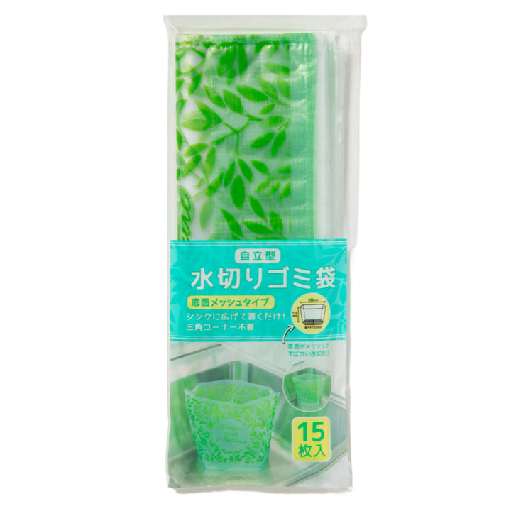 水切り袋 自立型 水切りゴミ袋 リーフ柄 15枚入り