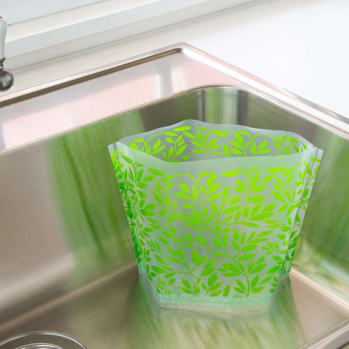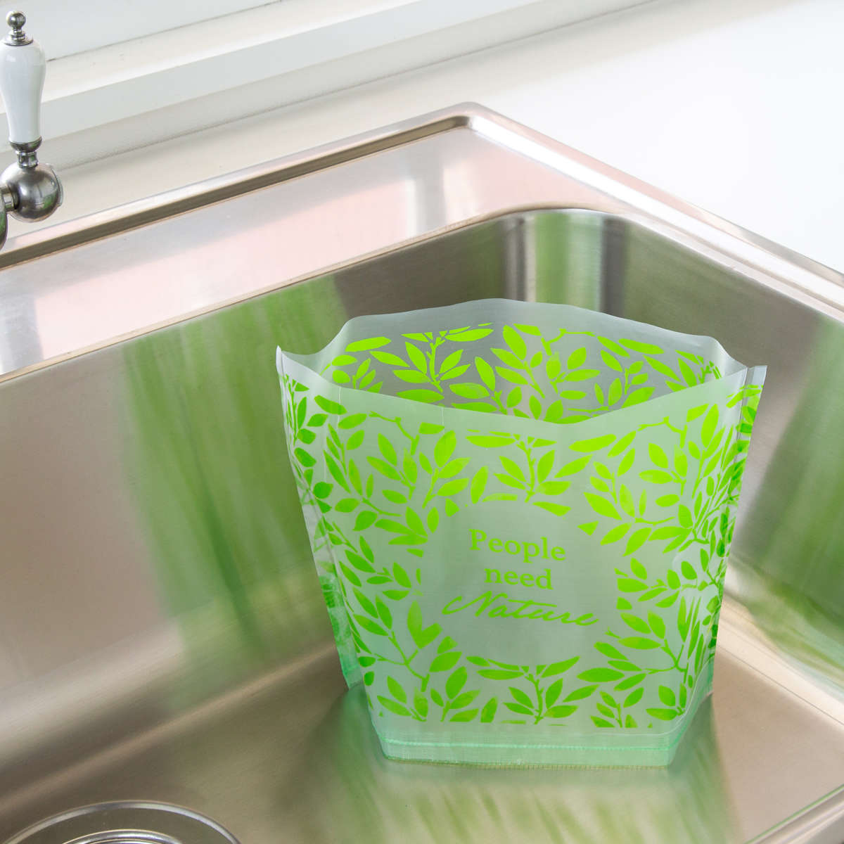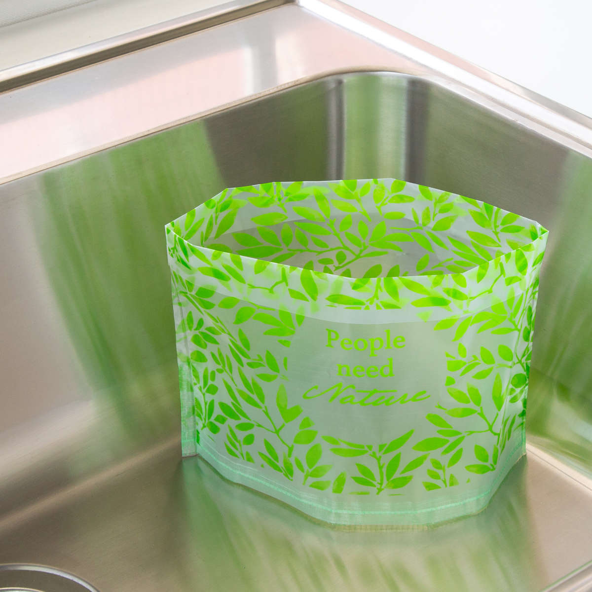 場所を取る三角コーナーの代わりに、シンクに広げて置くだけで使える自立式の水切り袋です。生活感が出やすいごみ袋も、爽やかなリーフ柄でキッチンに自然と馴染みます。