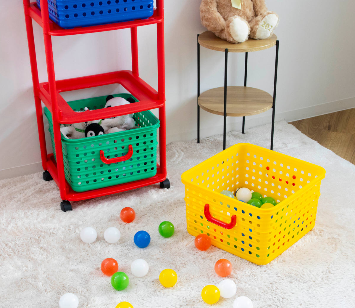 3つのカラフルなバスケットが入った3段のバスケットラックは、お子様のお片付け習慣をサポートします。色で分けて収納するものを決められるので、小さなお子様でも覚えやすく、ゲーム感覚で楽しくお片付けの習慣が身に付きます。フタのないシンプルな形状のバスケットで、お子様が自分でおもちゃを片付けやすくなっています。