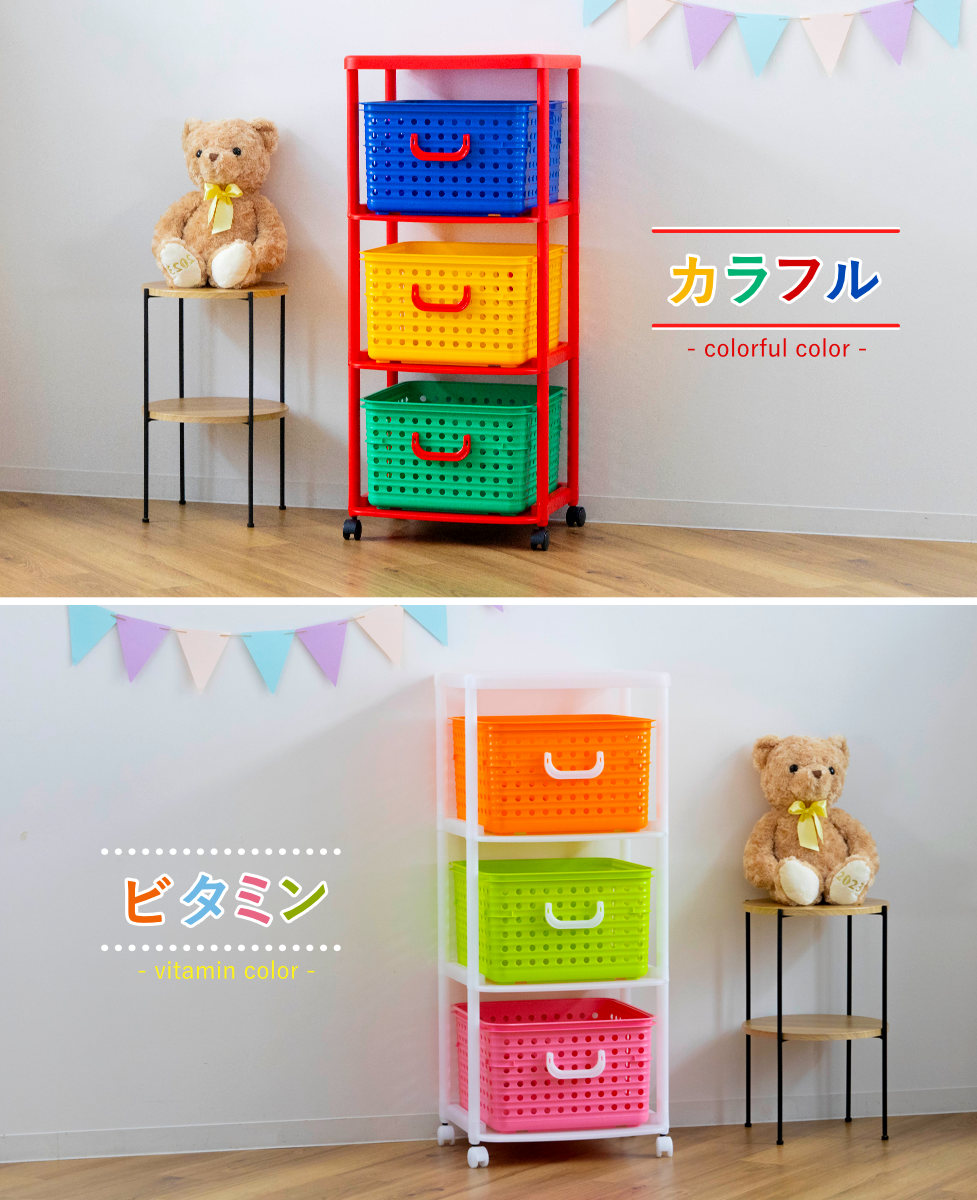 バスケットラックは、はっきりとした色合いの「カラフル」と、明るい色合いの「ビタミン」の2カラー展開しています。どちらのカラーもカラフルな配色で、子供部屋にピッタリなデザインです。お部屋の雰囲気や、お好みに合わせてお好きなカラーをお選びいただけます。