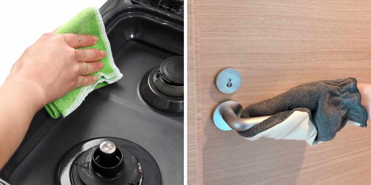 から拭きで静電気の力によりホコリを集めたあと、水拭きで汚れを乳化して落とします。髪の毛の1/120の極細繊維で鍵状の先端が目に見えない凹凸に入り込み、小さな汚れを取り除きます。