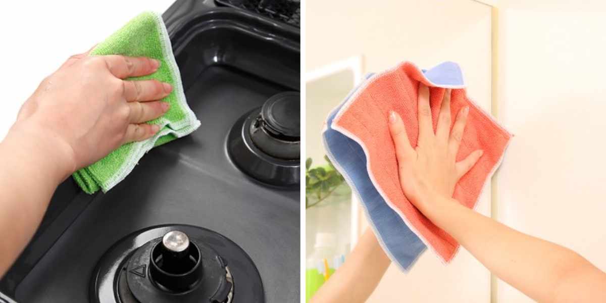 から拭きで静電気の力によりホコリを集めたあと、水拭きで汚れを乳化して落とします。髪の毛の1/120の極細繊維で鍵状の先端が目に見えない凹凸に入り込み、小さな汚れを取り除きます。