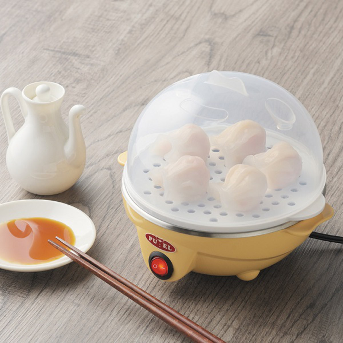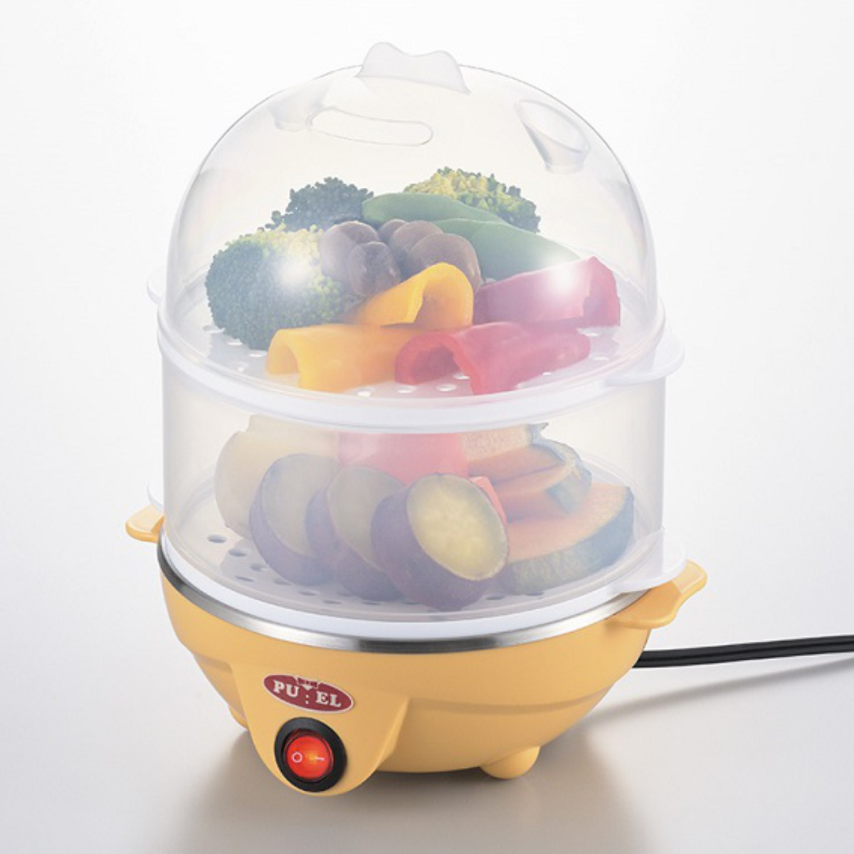 ゆで卵や蒸し料理が作れる、電気二段蒸し器です。コンセントさえあればどこでも作れて、スイッチを入れたらあとはお任せ。火加減も気にせず、放っておくだけでできあがるお手軽さが魅力です。