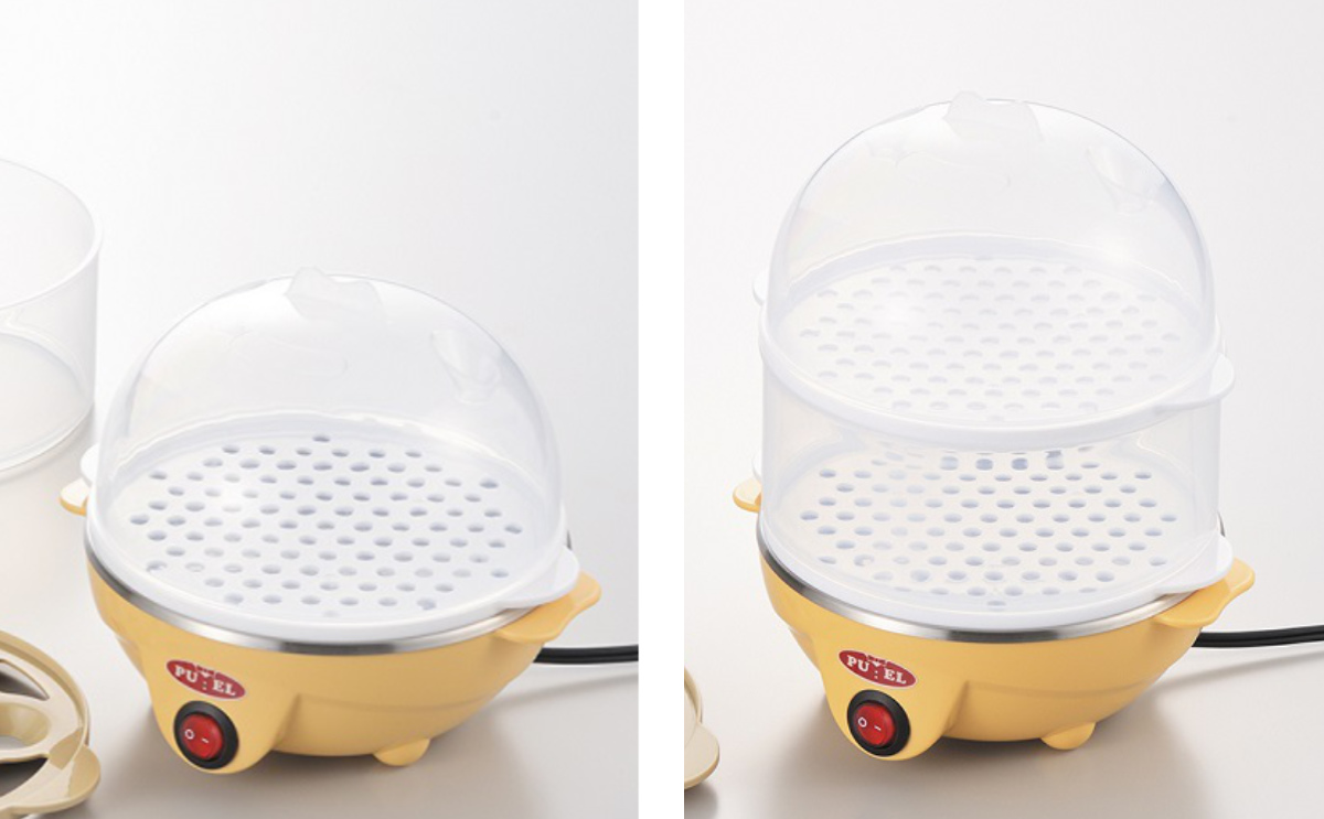 一段使用はコンパクトで、食卓に出しても圧迫感を与えません。二段使用では、上段・下段で同時に2メニュー作ることもできます。またゆで卵プレートをセットすれば、同時に最大7個のゆで卵が作れます。