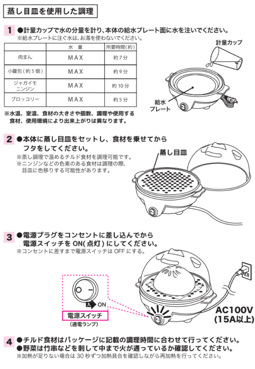 | 内容量 | 1セット (本体、フタ、枠、ゆで卵プレート、蒸し目皿×2、計量カップ) |