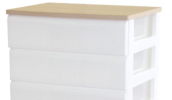 プラスチックチェストと組み合わされた木天板が、お部屋と調和し、ワンランク上の空間をつくり出します。