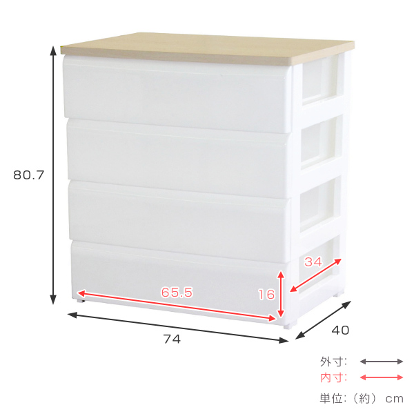 | サイズ | 外寸:約 幅74×奥行40×高さ80.7(cm) 内寸:約 幅65.5×奥行34×高さ16(cm) ※内寸は引き出し1段のサイズ |