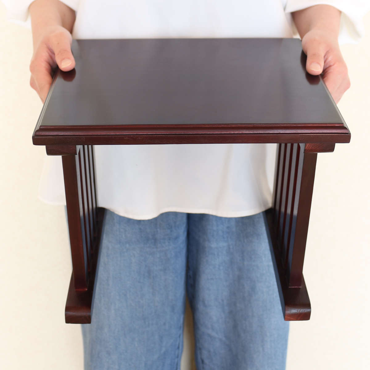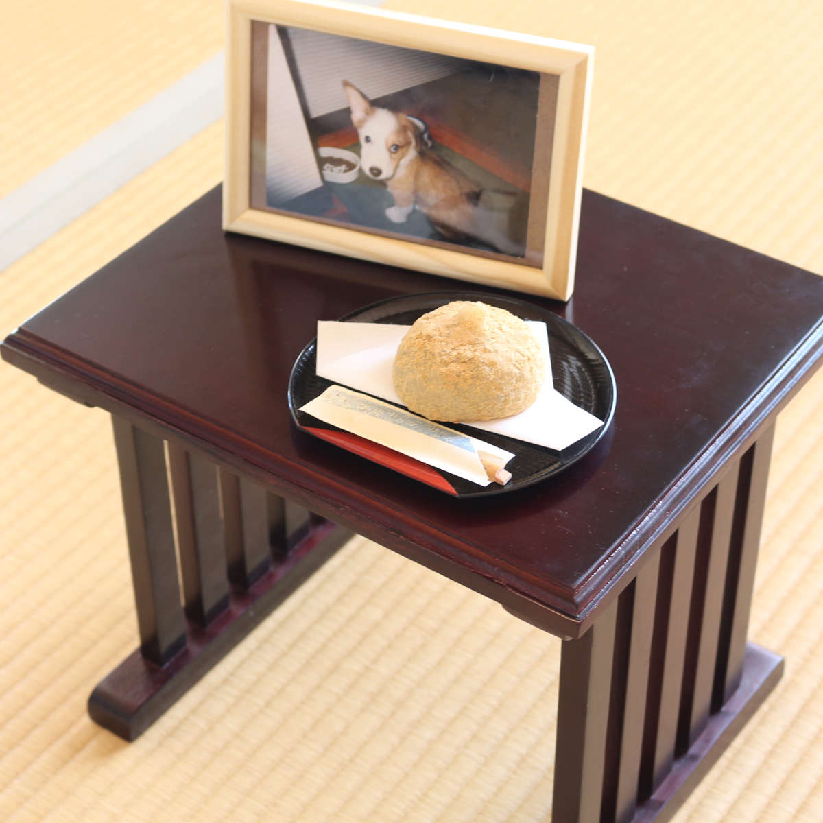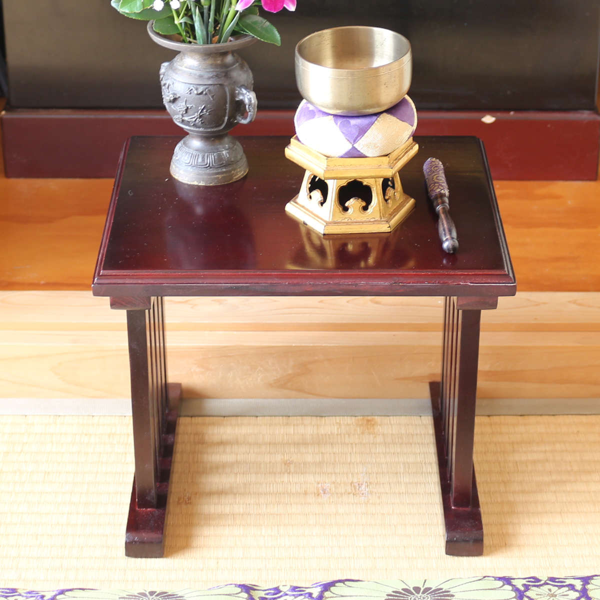 花立てや香炉、ローソク立て、線香立て、おりんなどをすっきりと配置できる仏壇前ミニテーブル。コンパクトな仏壇にもぴったりで、使い勝手の良さが魅力です。