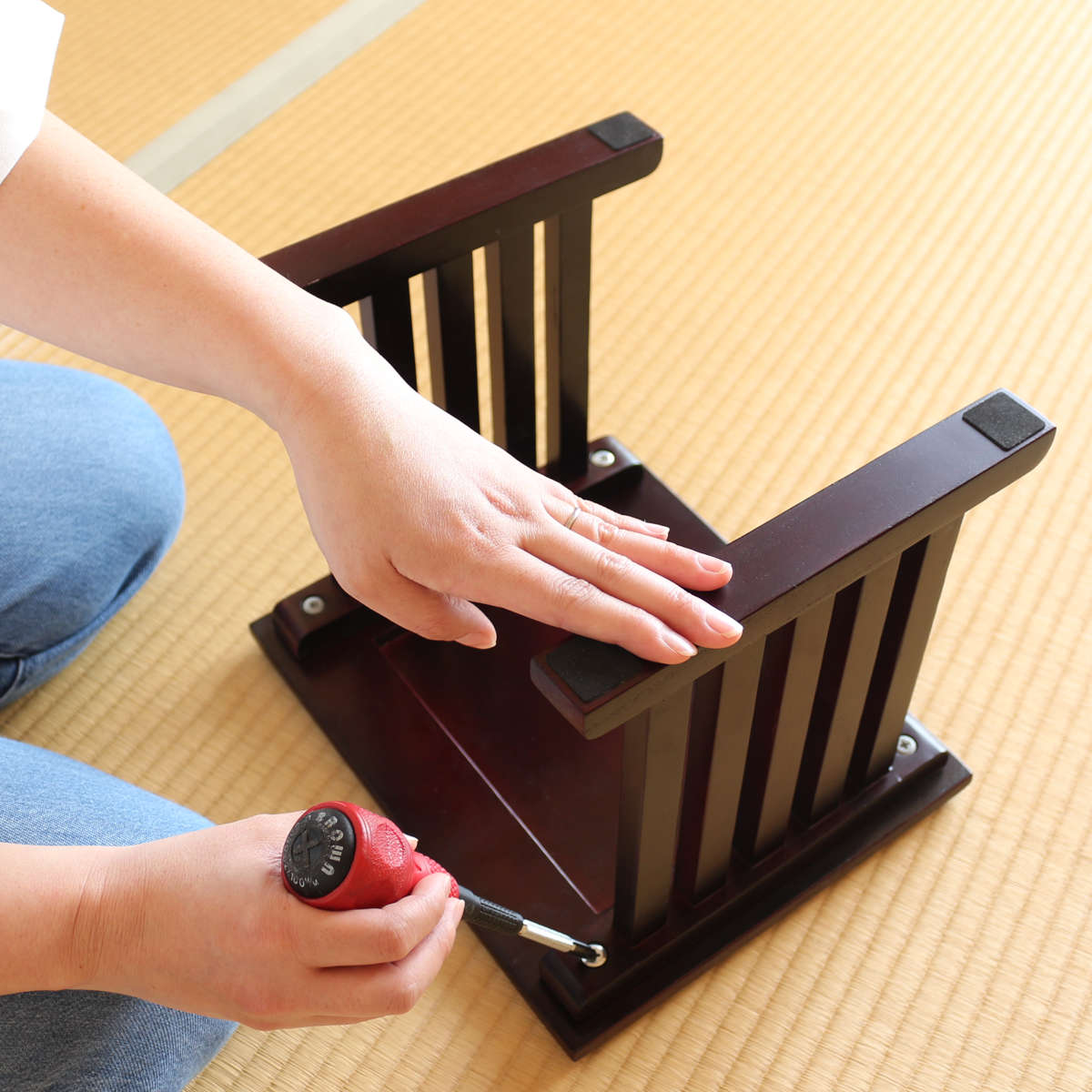 ボルト4本で簡単に組み立てられる仕様です。天板の裏側にはあらかじめ雌ネジが埋め込まれているため、位置を合わせてボルトを締めるだけで、スムーズに組み立てることができます。
