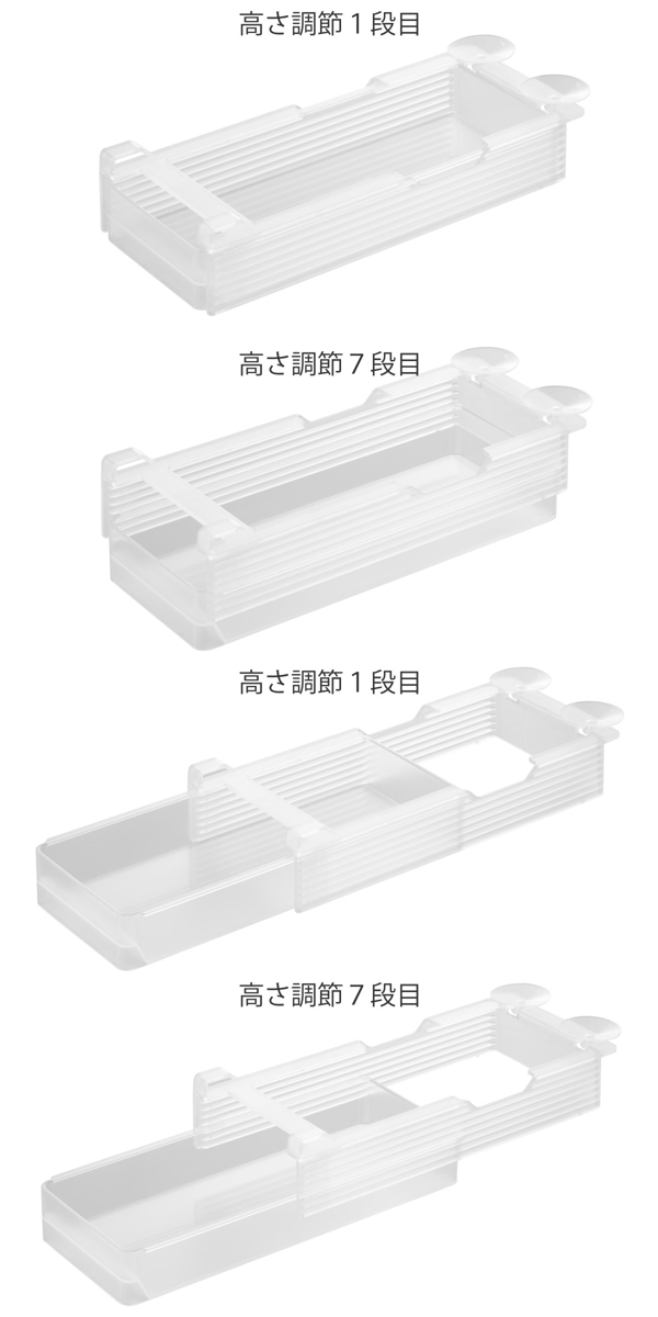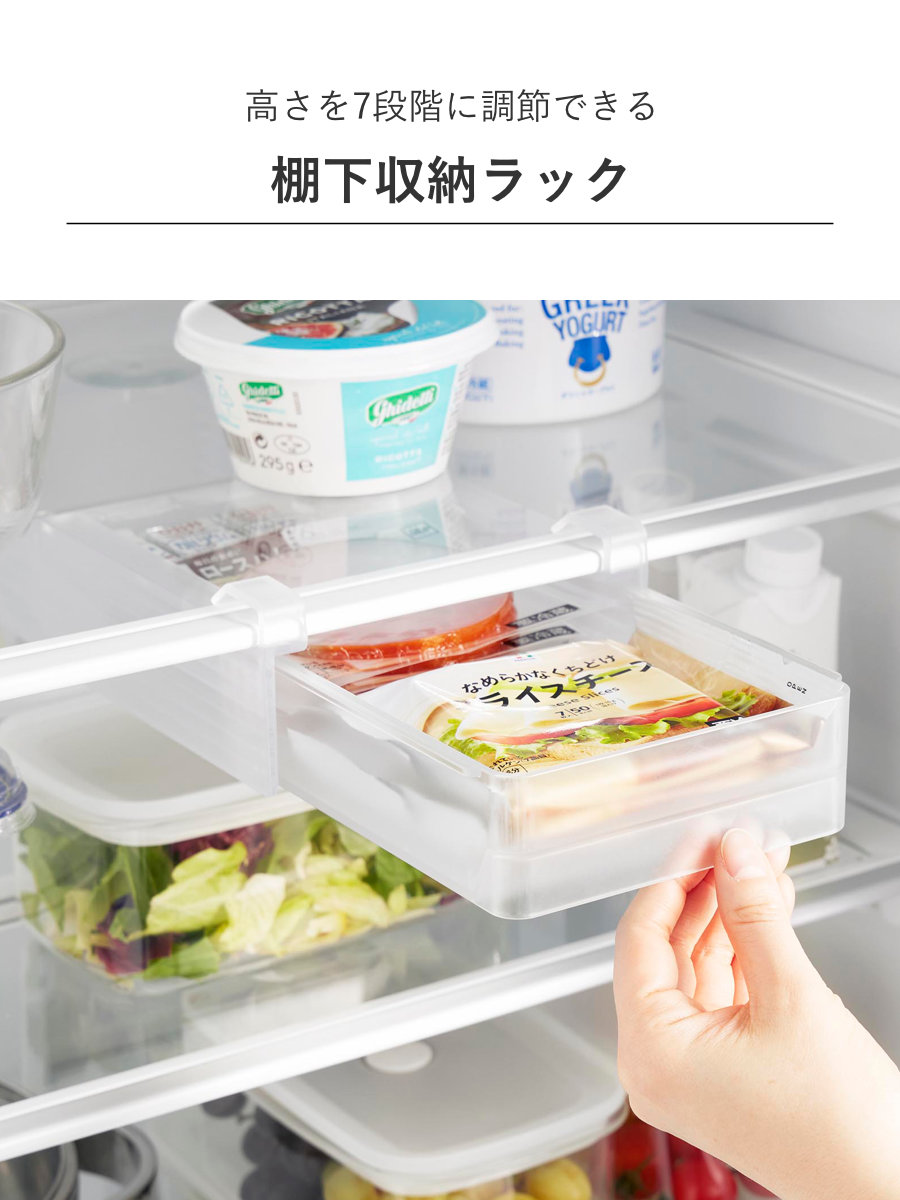 収納する物や隙間に合わせて高さを7段階に調節できる棚下収納ラック「S」です。棚の奥まで無駄なく使えるロングタイプで冷蔵庫の中をスッキリ整理整頓できます。