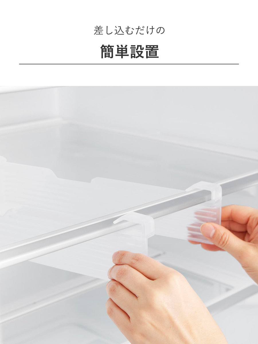 設置は、引っ掛け部を棚板に差し込み、吸盤で固定するだけの簡単仕様です。