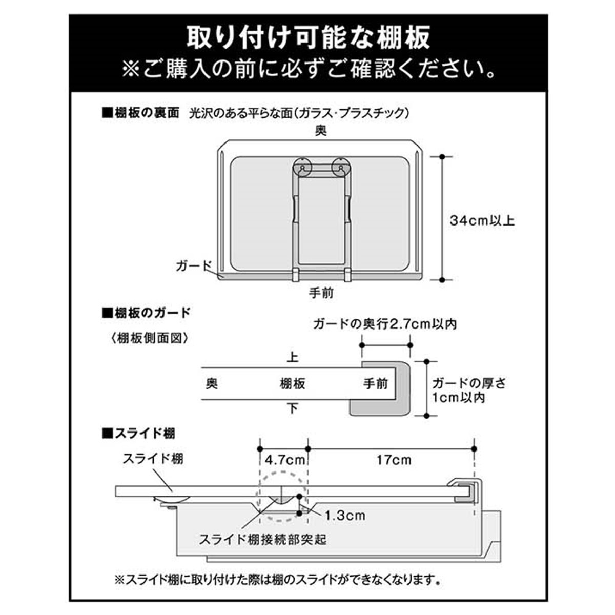 | 備考 | 【取り付け可能な棚板】 棚板の裏面:光沢のある平らな面(ガラス・プラスチック) 棚板のガード:奥行2.7cm以内・厚さ1cm以内 ※棚板のサイズや形状によっては、設置できない場合があります。 |