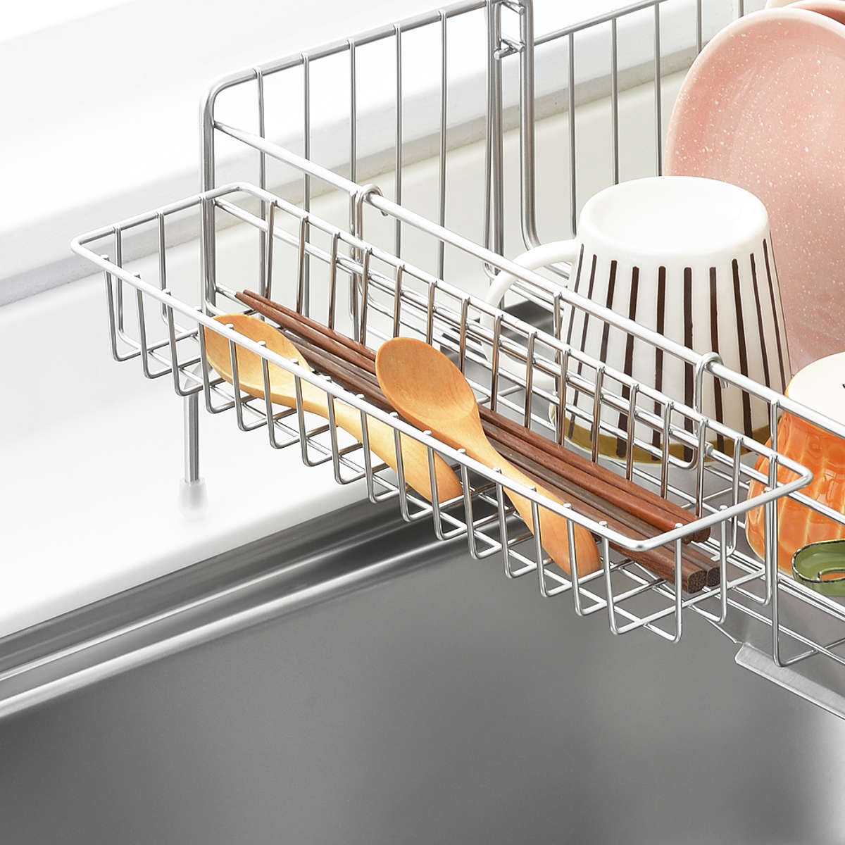 好きな位置に引っ掛けるだけで、簡単に取り付けられます。浅型タイプなので、カトラリーはもちろん、水筒のパッキンなど細かな小物もしっかり乾かせます。