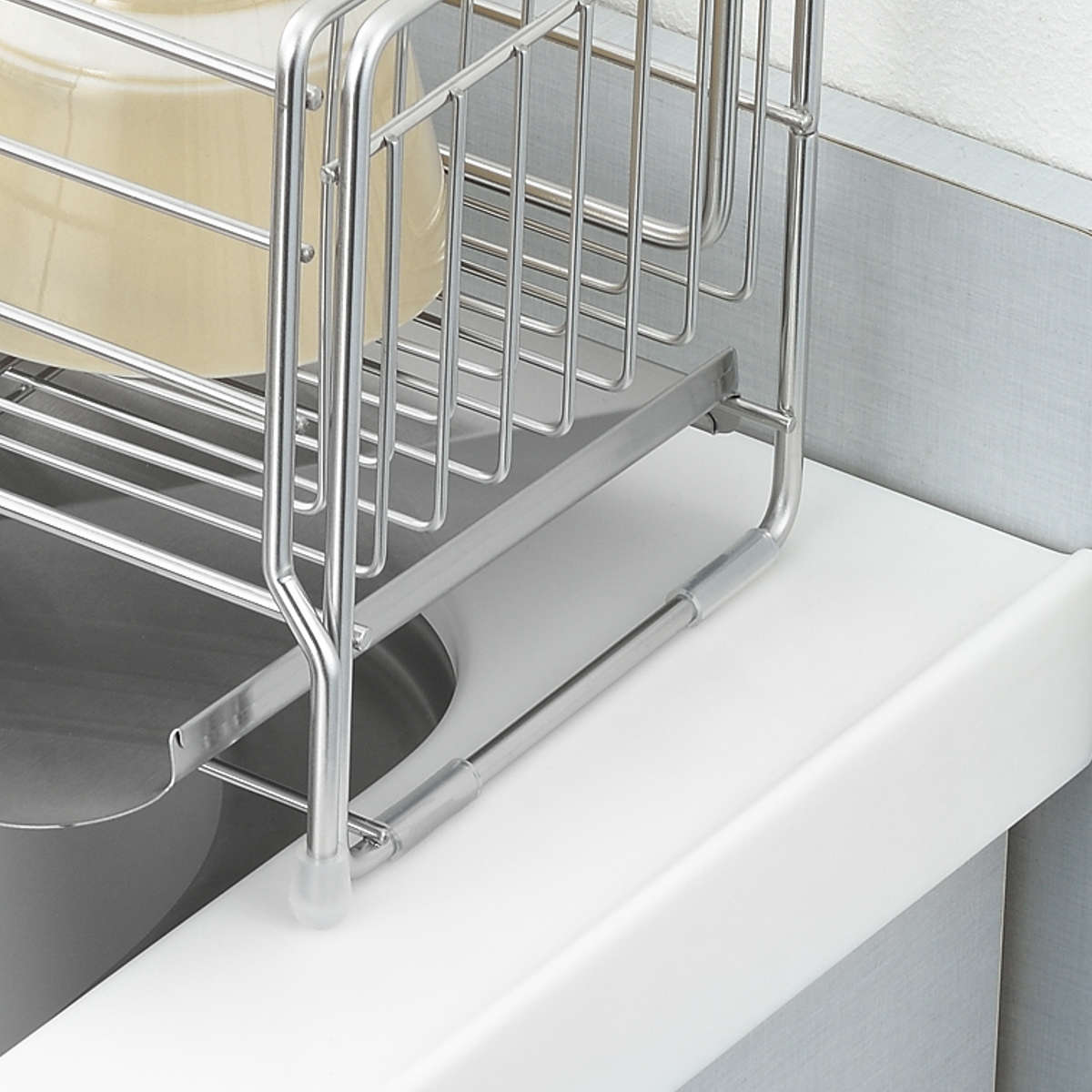 シンクと接するのは脚部のみなので、奥行きが合えばシンクをまたいで設置可能。来客時や家族での食事など洗い物が多いときも、サッとスライドさせて食器をたっぷり収納できます。