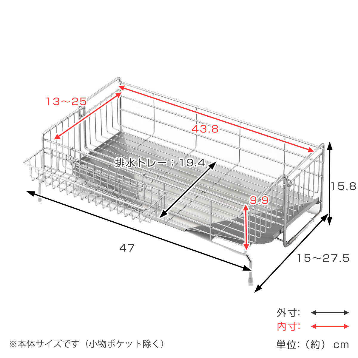 | 材質 | 本体・小物ポケット:18-8ステンレス 斜めトレー:18-0ステンレス 脚ゴム・クッションチューブ:シリコーンゴム |