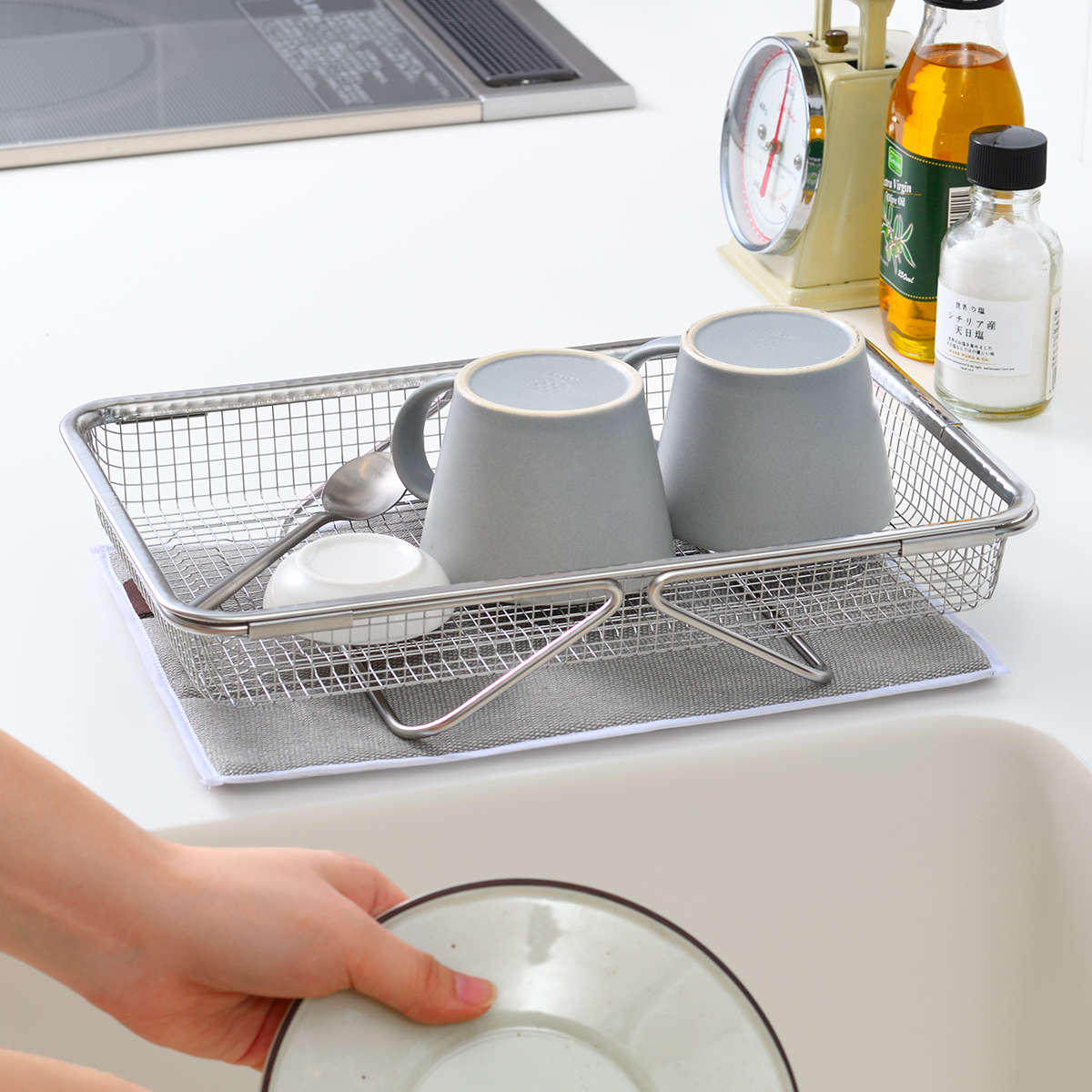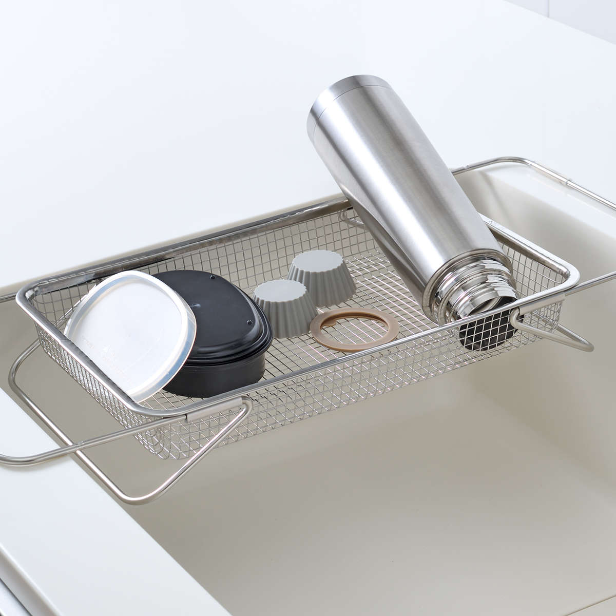 ワイヤータイプでは水切りしづらい、小さな調理器具や食器のちょい置きにぴったりです。水筒のフタやパッキンなど細かなパーツも、網状なので落ちる心配がありません。