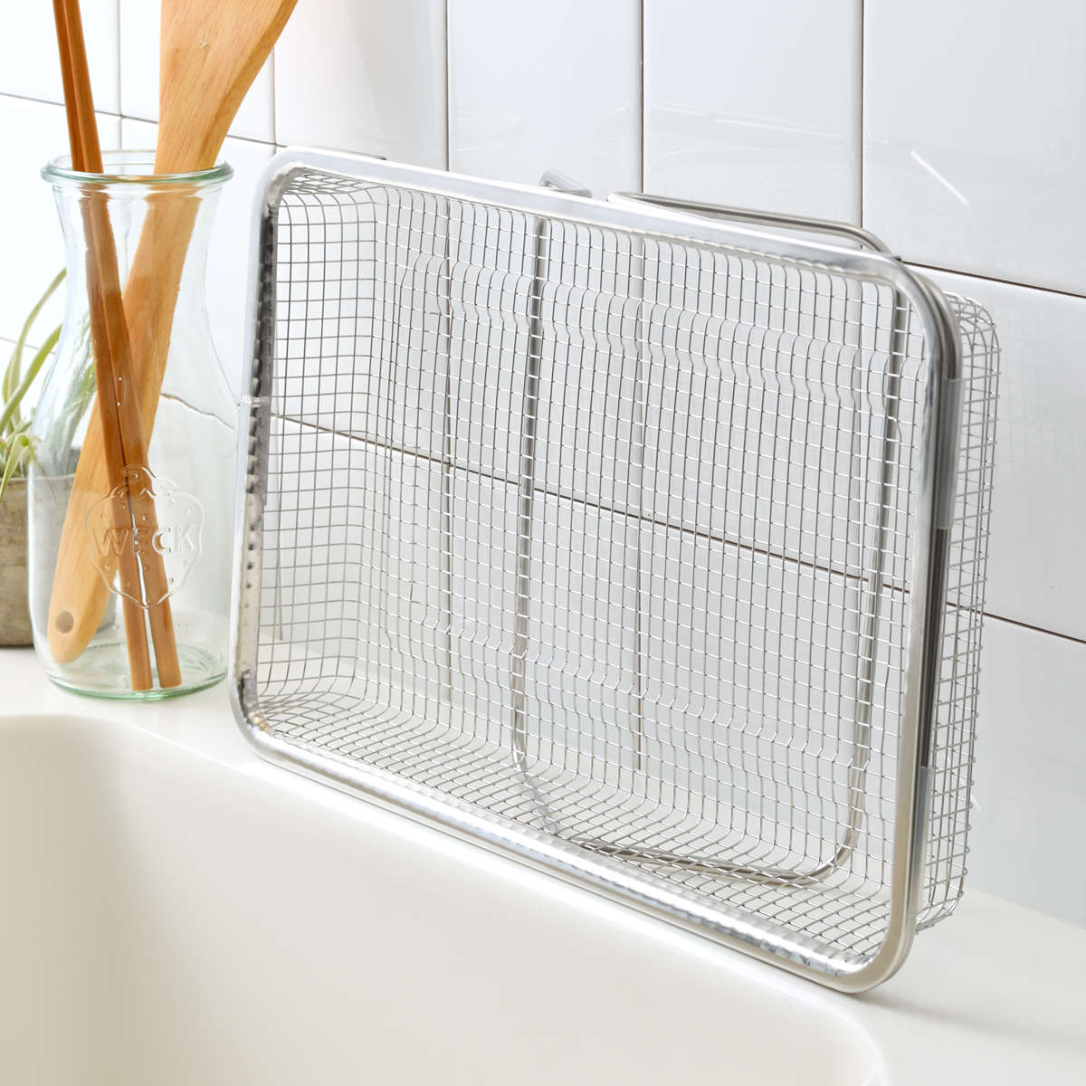 野菜の水切りはもちろん、乾きづらいトレーやペットボトル、缶詰容器などのリサイクル品の乾燥にも活躍。キッチンのちょっとした水切りスペースとして、幅広く使えるアイテムです。
