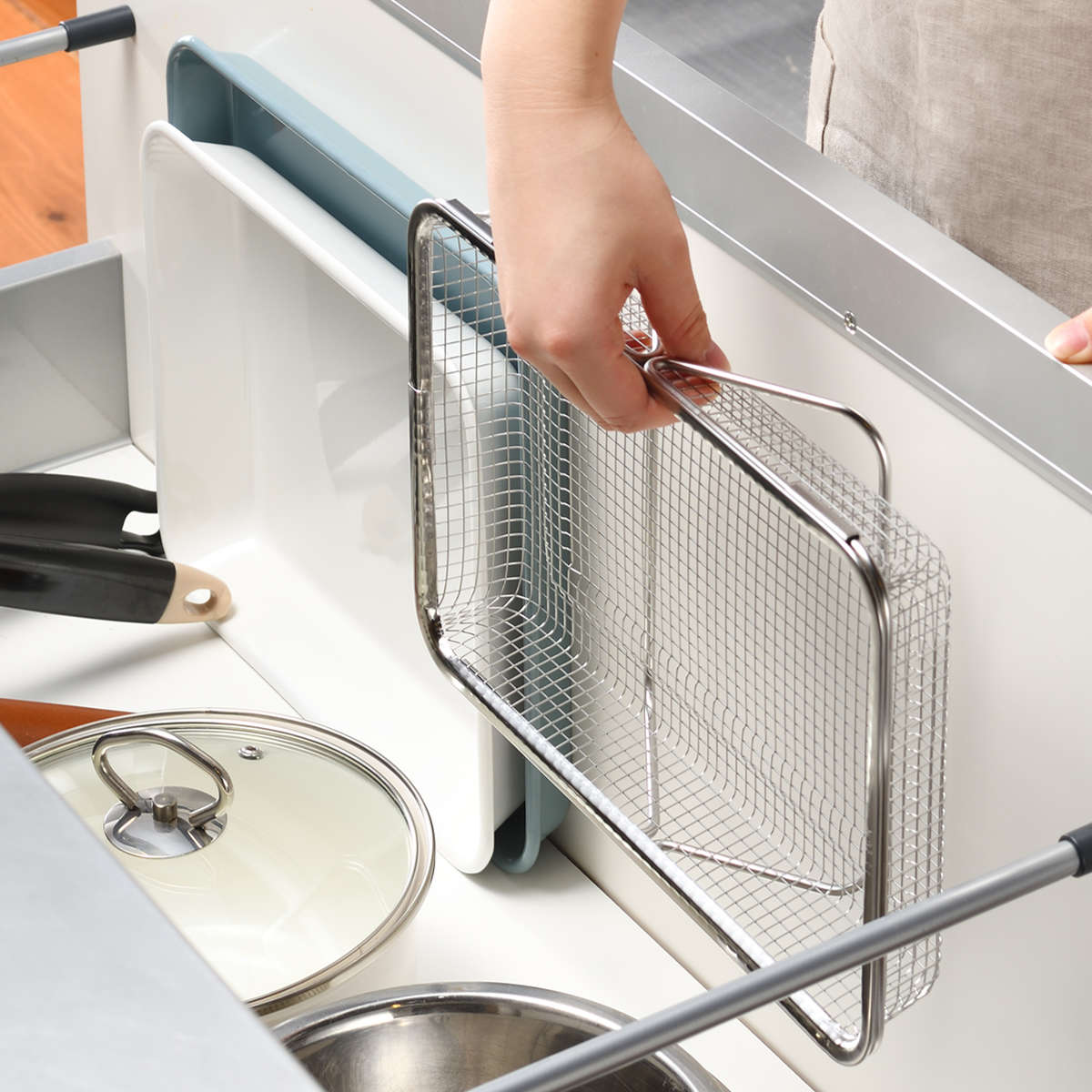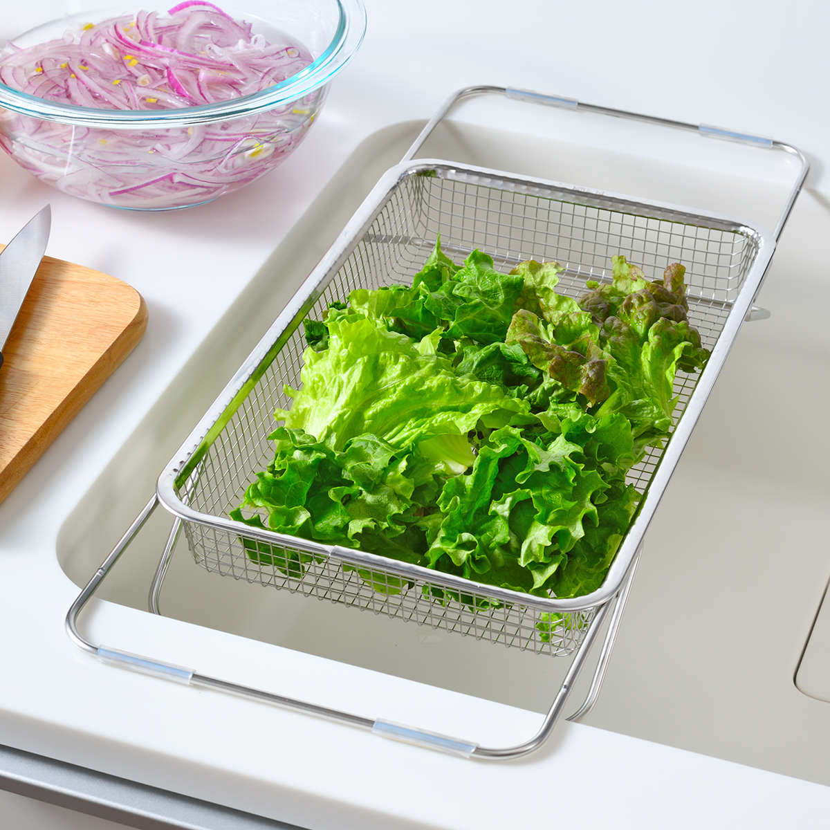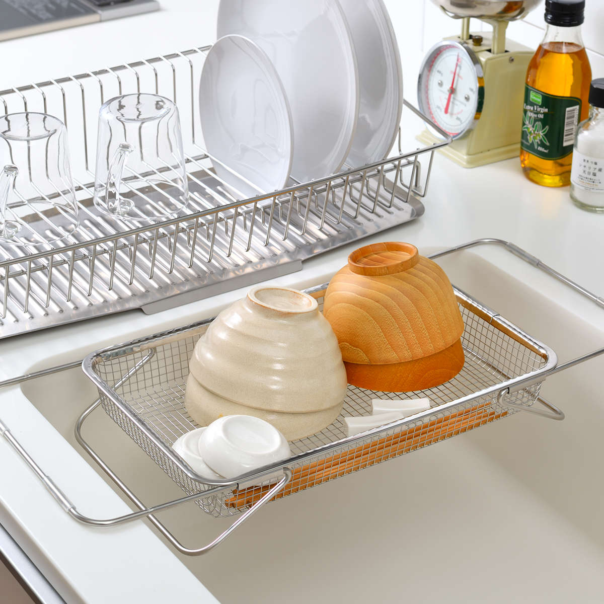 伸縮式アームでシンクに渡して使える水切りかご。限られたスペースでもしっかり活躍し、賃貸や一人暮らしのキッチンに最適です。サブの水切りとしても便利に使えます。
