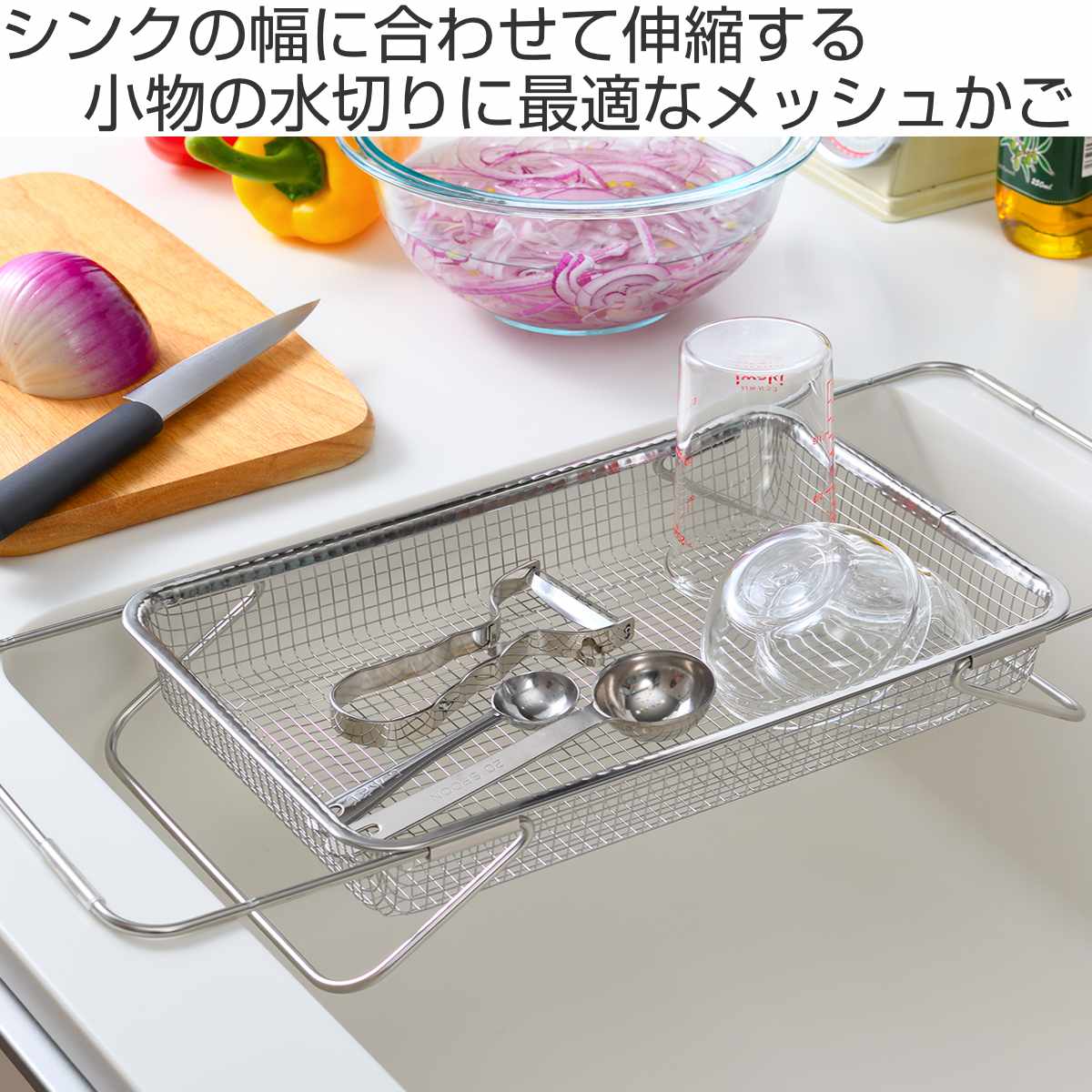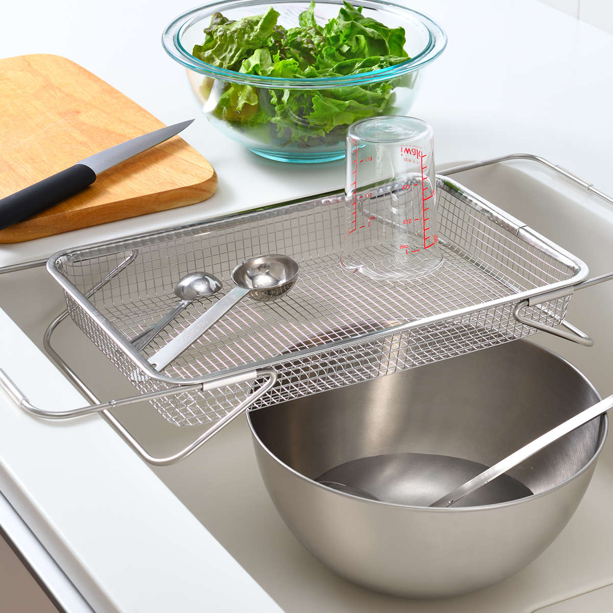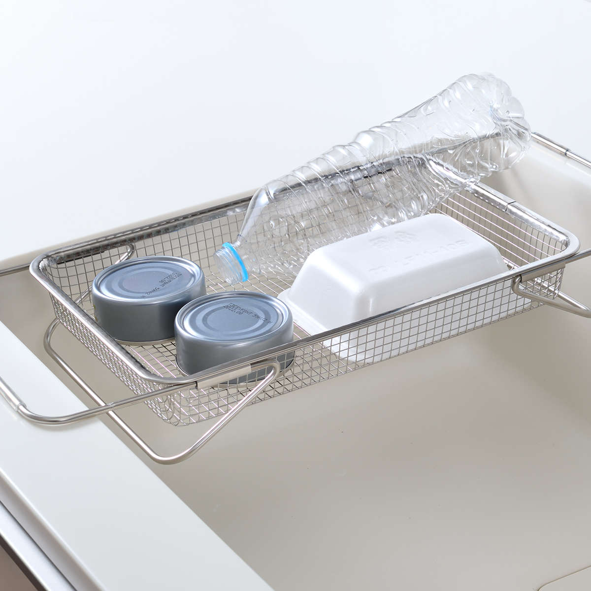 伸縮式アームでシンクに渡して使える水切りかご。限られたスペースでもしっかり活躍し、賃貸や一人暮らしのキッチンに最適です。サブの水切りとしても便利に使えます。