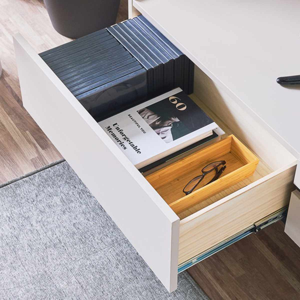 左右の引出しは、リビング周りの小物やDVDケースの収納に便利です。大容量の収納力で、散らかりがちなリビングもスッキリ整います。フルスライドレール仕様なので奥まで見渡せ、たっぷり収納してもスムーズに開閉できます。
