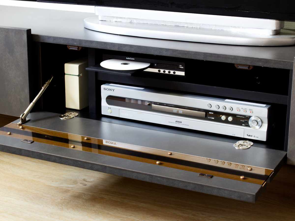 中央のフラップ扉内には横型と縦型の収納スペースがあり、AV機器やルーターなどを収納できます。棚板は取り外しができ、背の高い物も収納可能。前板にはガラスが付いているため、扉を閉めたままでもリモコン操作ができます。